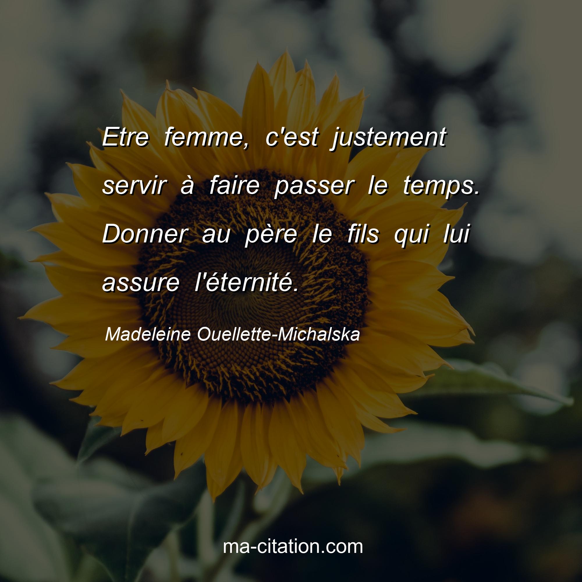 Citation sur la vie de Madeleine Ouellette-Michalska :Etre femme, c'est justement servir à faire passer le temps. Donner au père le fils qui lui assure l'éternité.