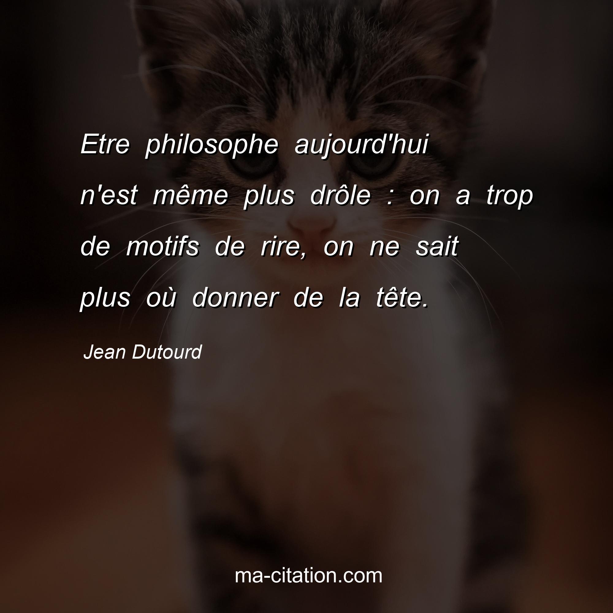 Citation sur la vie de Jean Dutourd :Etre philosophe aujourd'hui n'est même plus drôle : on a trop de motifs de rire, on ne sait plus où donner de la tête.