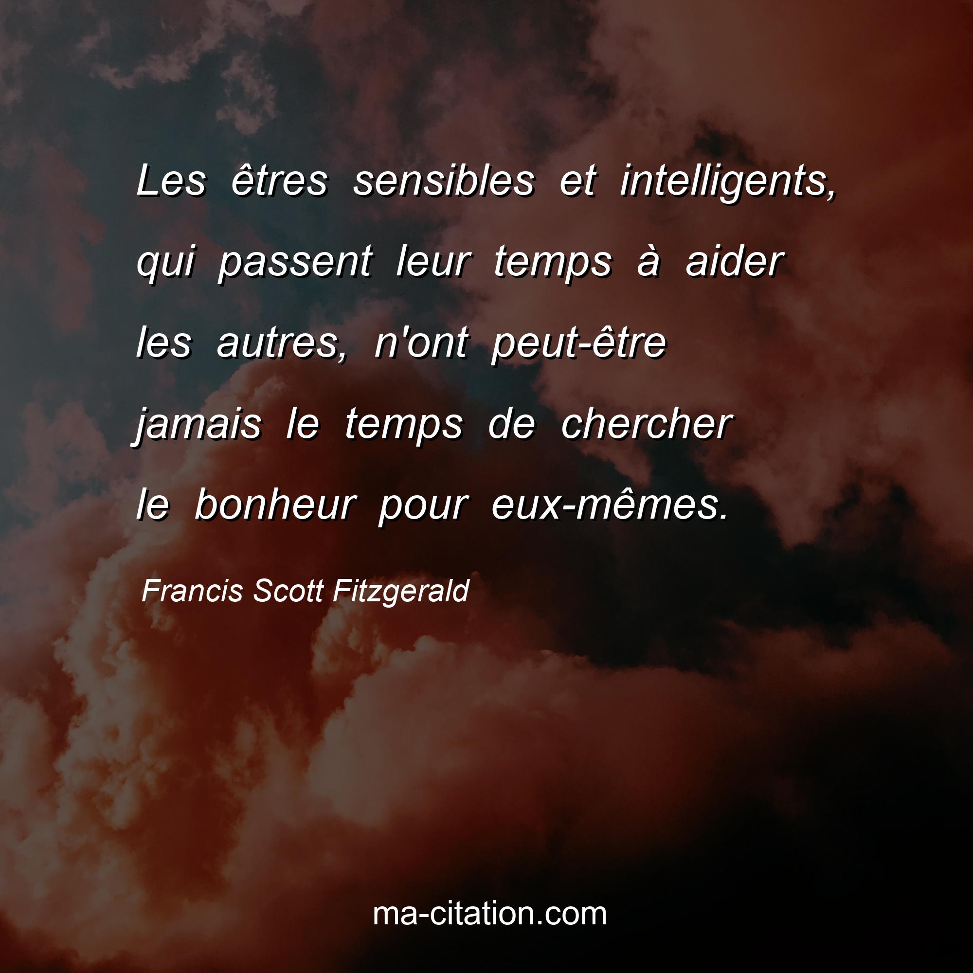 Citation sur la vie de Francis Scott Fitzgerald :Les êtres sensibles et intelligents, qui passent leur temps à aider les autres, n'ont peut-être jamais le temps de chercher le bonheur pour eux-mêmes.