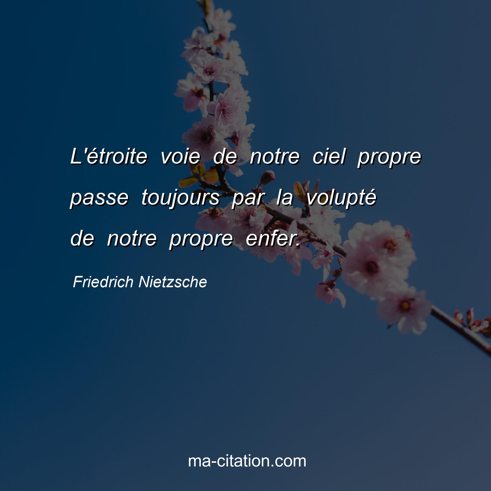 Citation sur la vie de Friedrich Nietzsche :L'étroite voie de notre ciel propre passe toujours par la volupté de notre propre enfer.