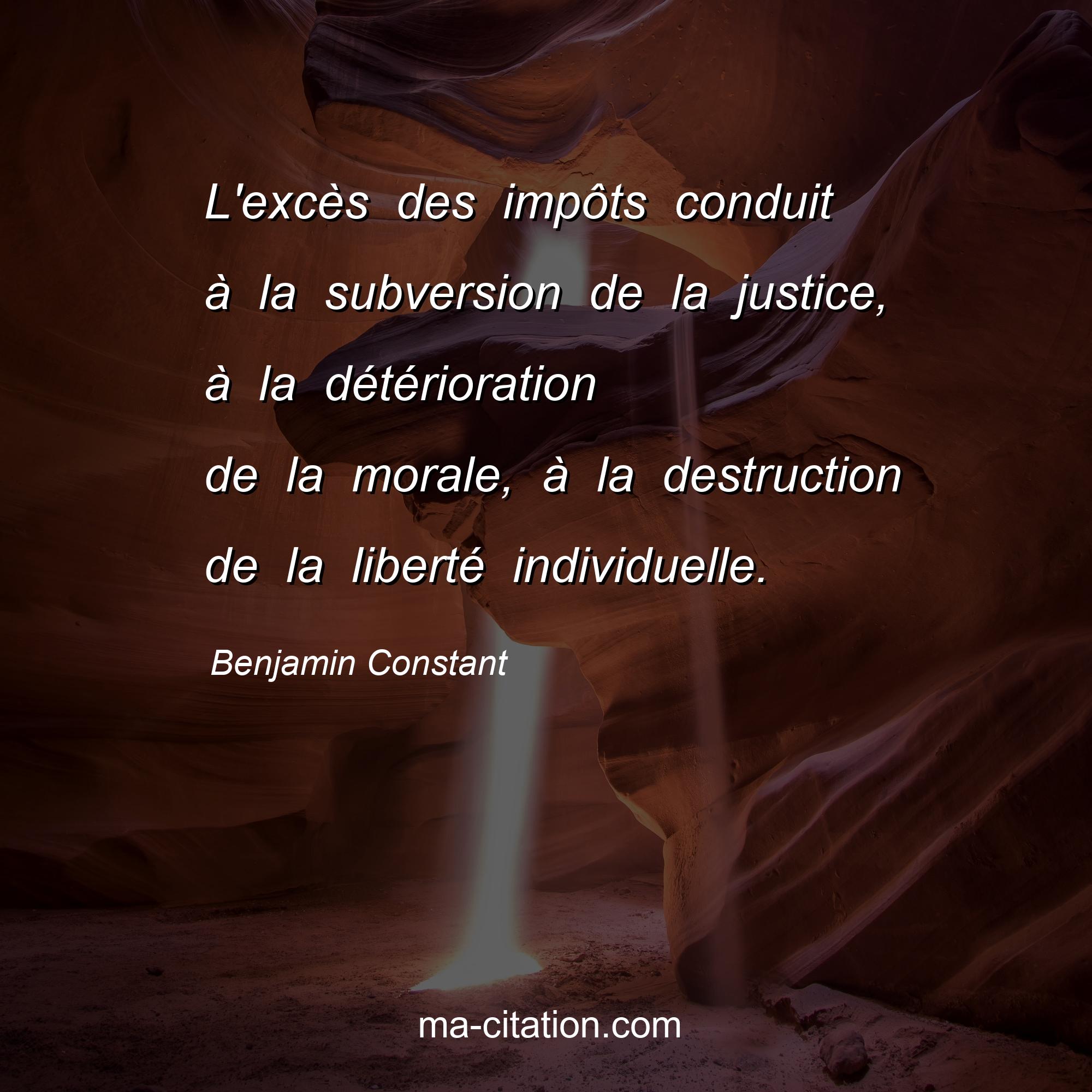 Citation sur la vie de Benjamin Constant :L'excès des impôts conduit à la subversion de la justice, à la détérioration de la morale, à la destruction de la liberté individuelle.