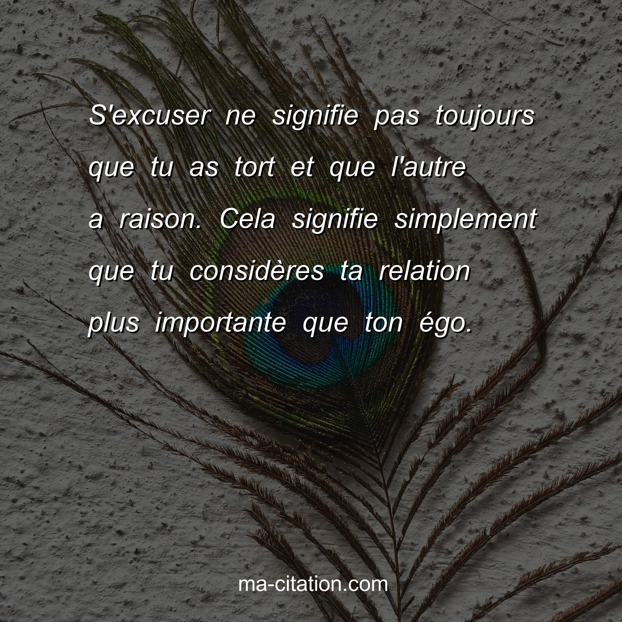 Citation sur la vie :S'excuser ne signifie pas toujours que tu as tort et que l'autre a raison. Cela signifie simplement que tu considères ta relation plus importante que ton égo.
