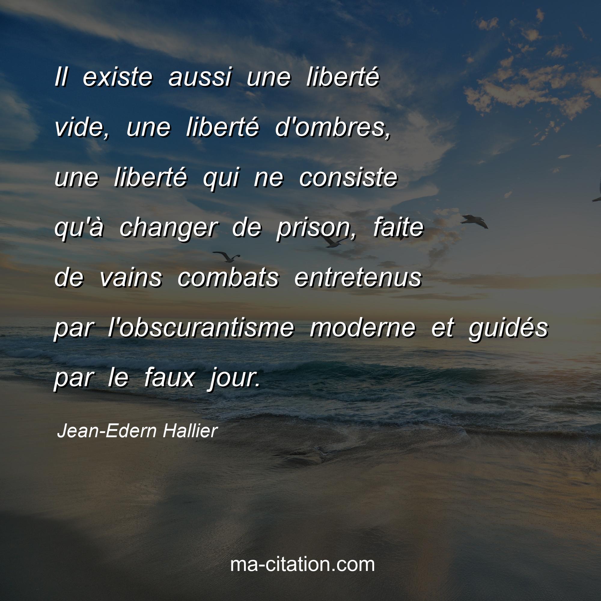 Citation sur la vie de Jean-Edern Hallier :Il existe aussi une liberté vide, une liberté d'ombres, une liberté qui ne consiste qu'à changer de prison, faite de vains combats entretenus par l'obscurantisme moderne et guidés par le faux jour.
