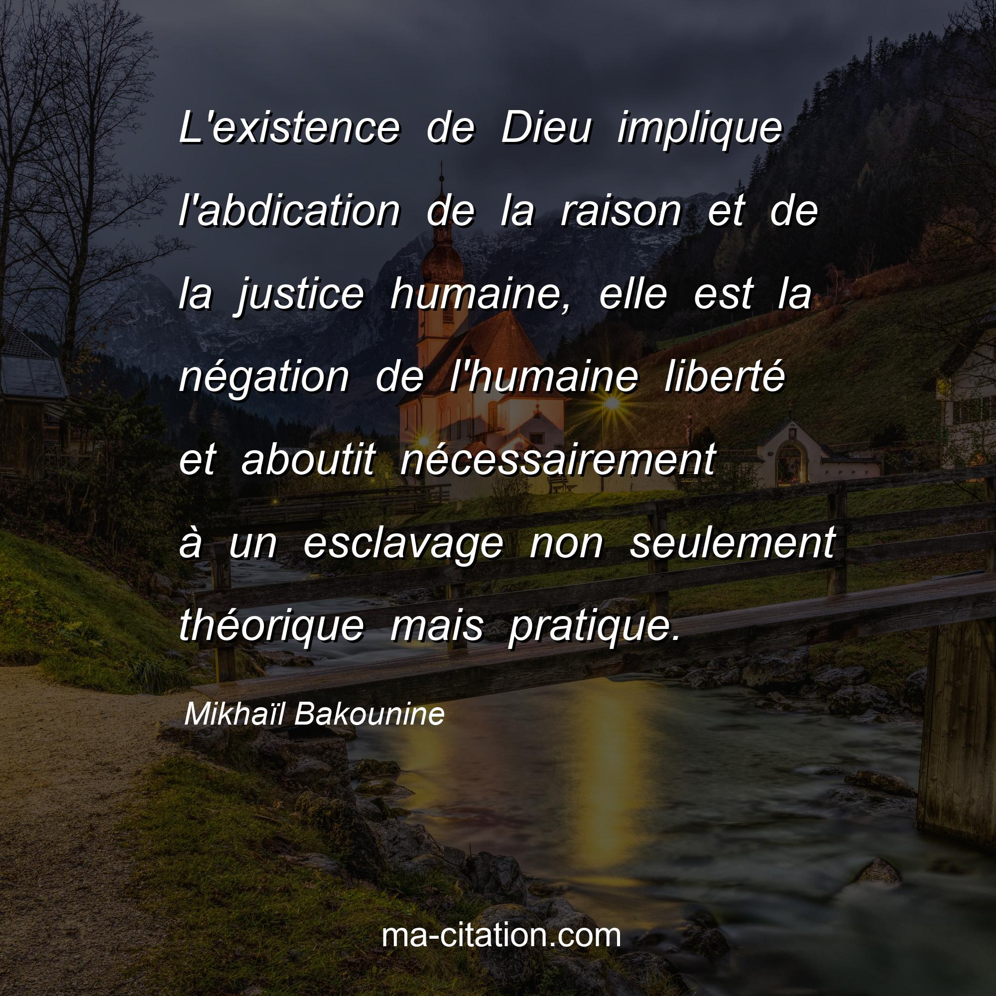 Citation sur la vie de Mikhaïl Bakounine :L'existence de Dieu implique l'abdication de la raison et de la justice humaine, elle est la négation de l'humaine liberté et aboutit nécessairement à un esclavage non seulement théorique mais pratique.
