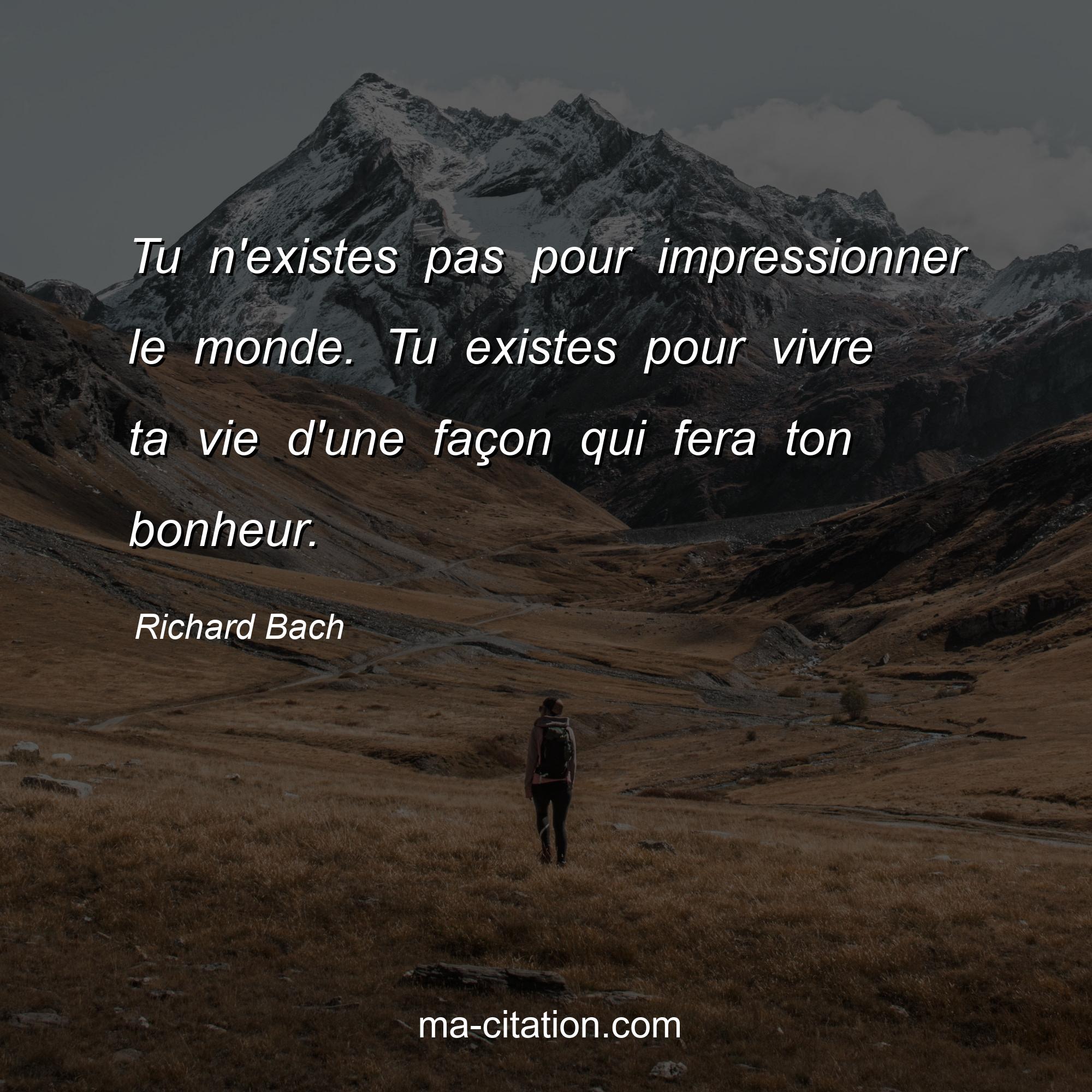 Citation sur la vie de Richard Bach :Tu n'existes pas pour impressionner le monde. Tu existes pour vivre ta vie d'une façon qui fera ton bonheur.