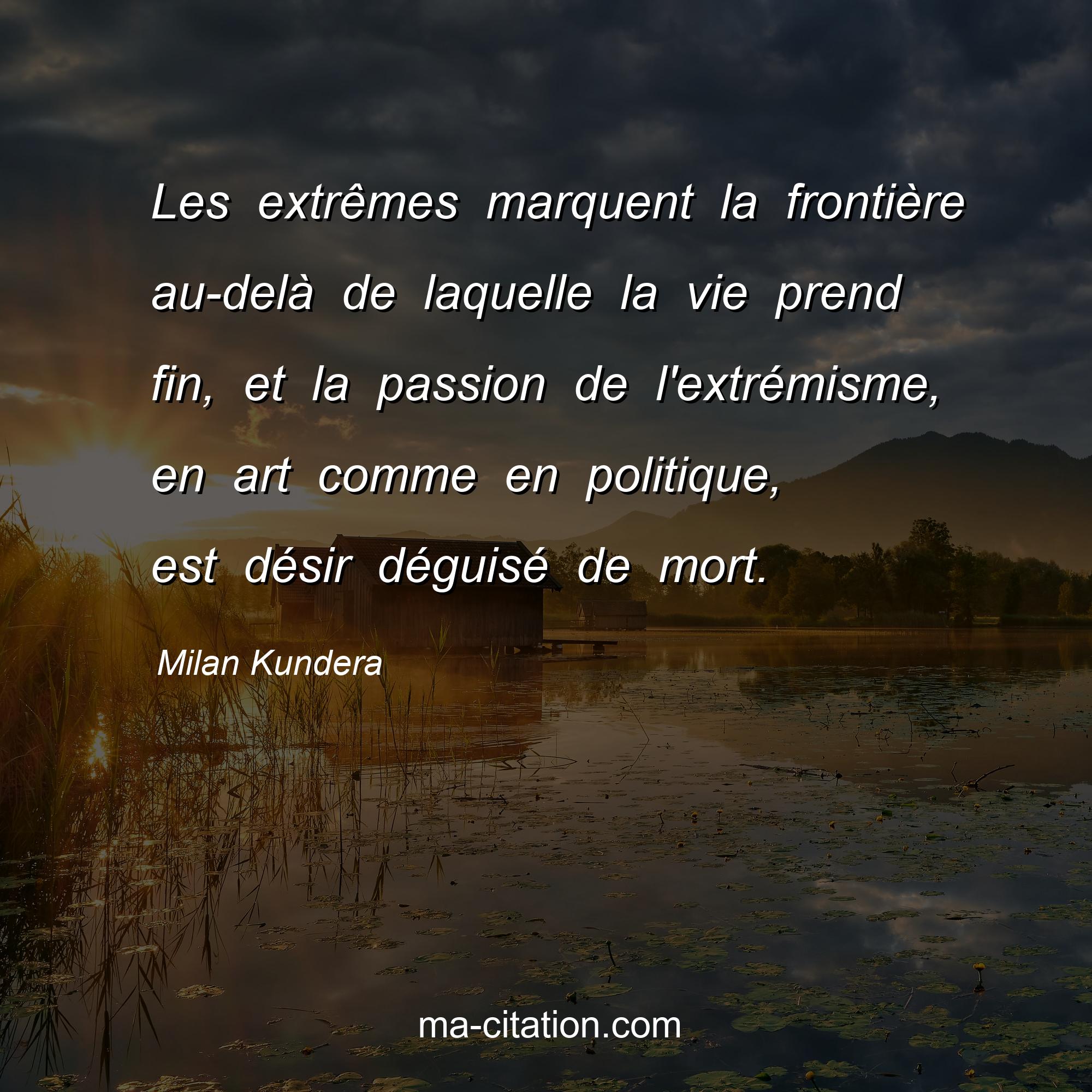 Citation sur la vie de Milan Kundera :Les extrêmes marquent la frontière au-delà de laquelle la vie prend fin, et la passion de l'extrémisme, en art comme en politique, est désir déguisé de mort.