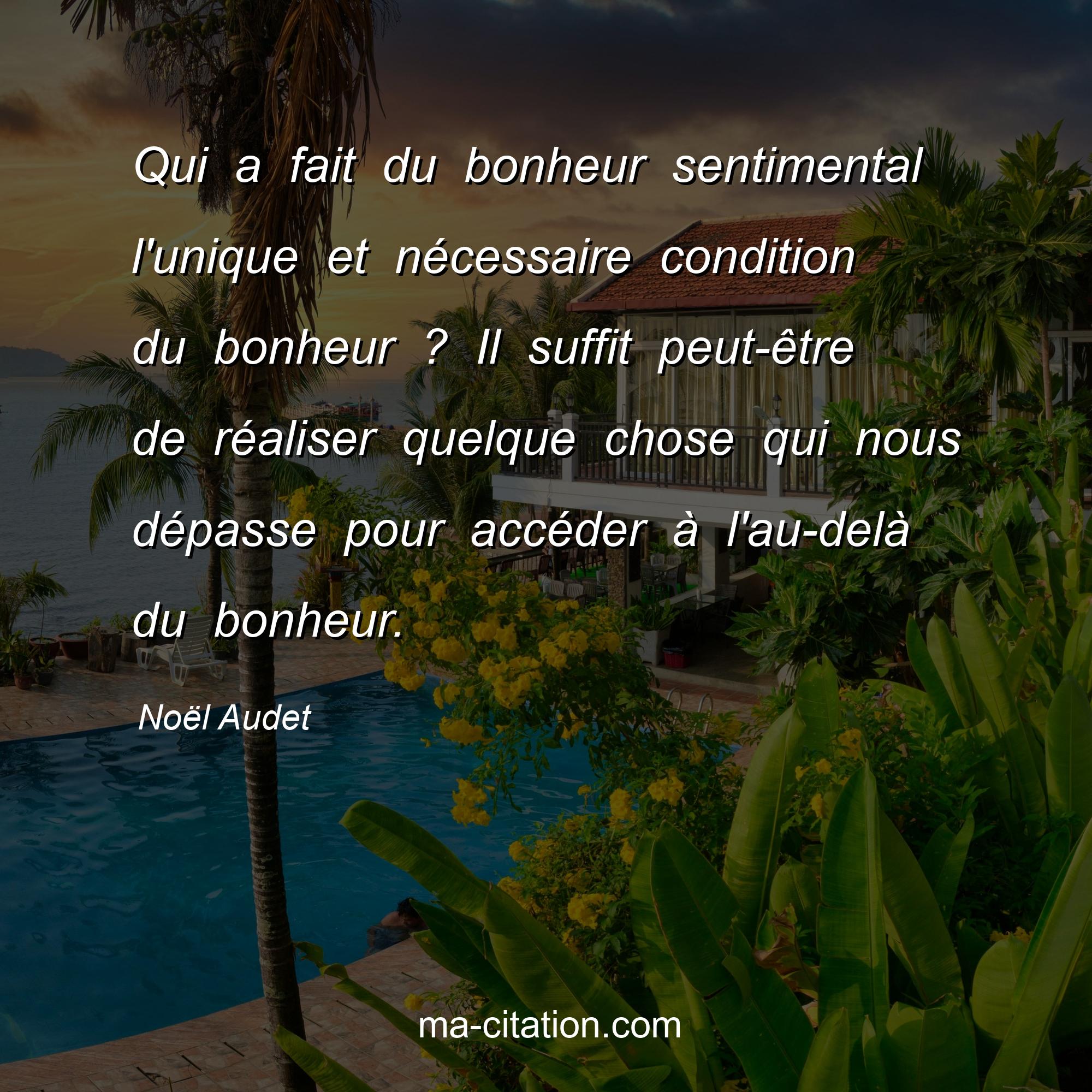 Noël Audet est l'auteur de la citation sur la vie "Qui a fait du bonheur sentimental l'unique et nécessaire condition du bonheur ? Il suffit peut-être de réaliser quelque chose qui nous dépasse pour accéder à l'au-delà du bonheur.".