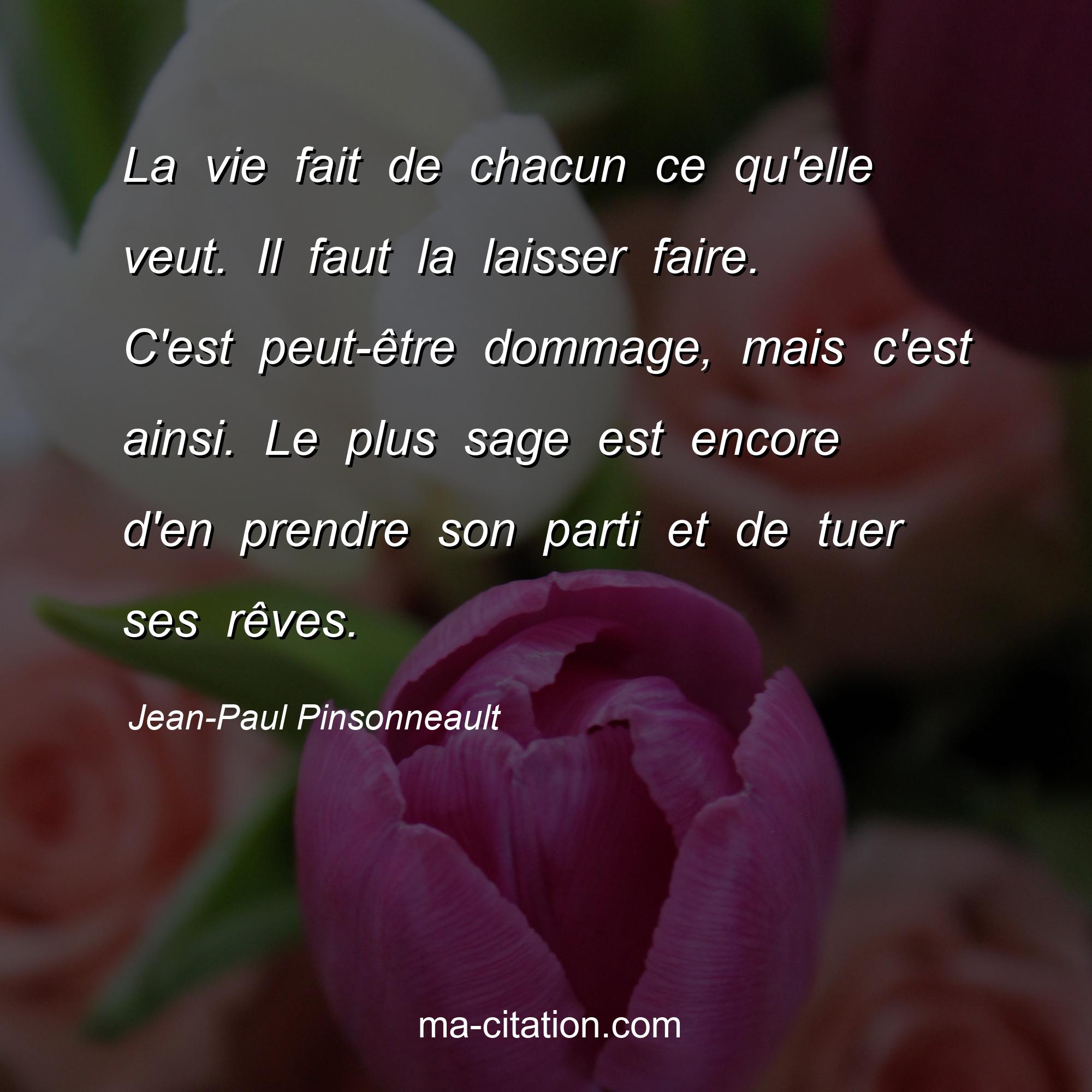 Jean-Paul Pinsonneault est l'auteur de la citation sur la vie "La vie fait de chacun ce qu'elle veut. Il faut la laisser faire. C'est peut-être dommage, mais c'est ainsi. Le plus sage est encore d'en prendre son parti et de tuer ses rêves.".