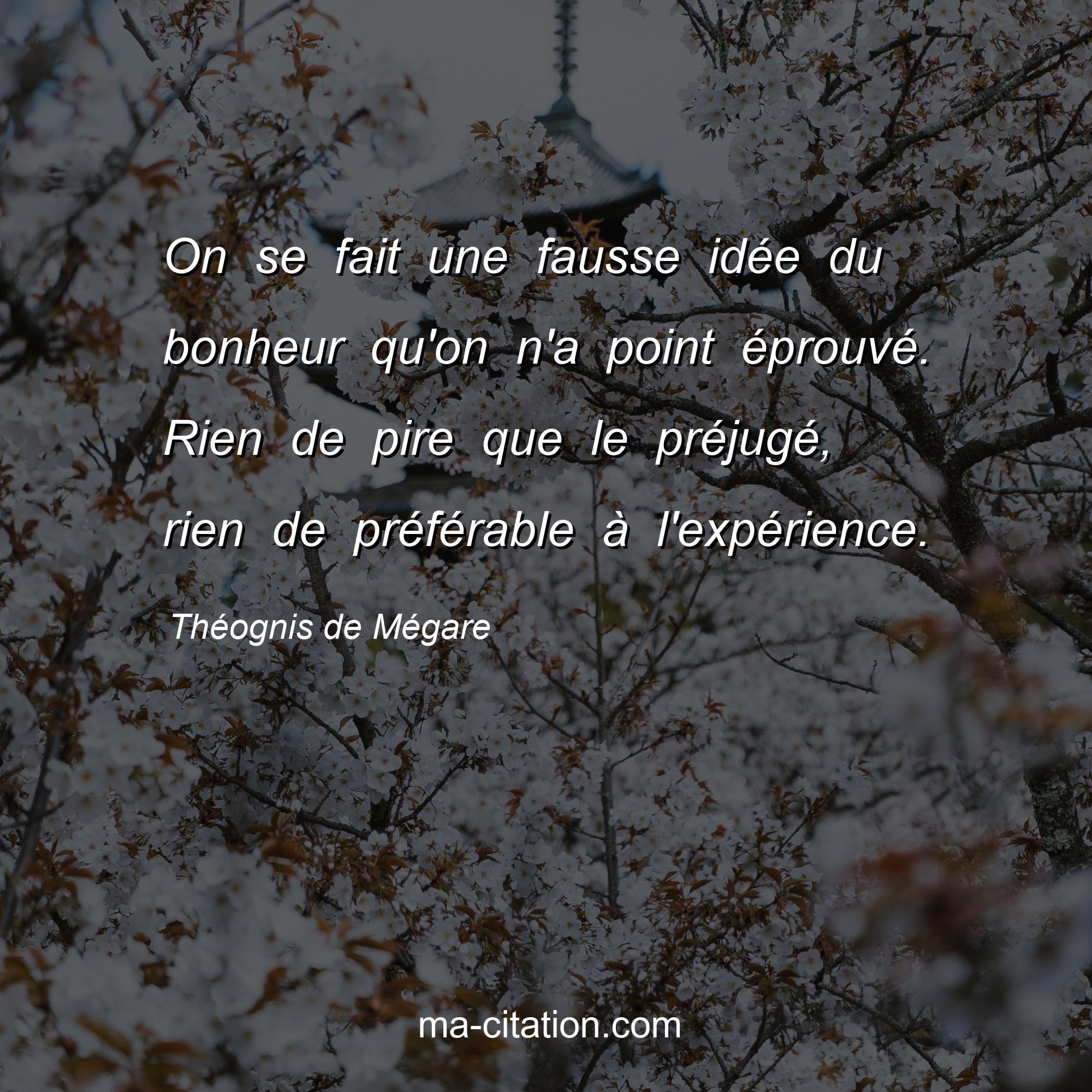 Citation sur la vie de Théognis de Mégare :On se fait une fausse idée du bonheur qu'on n'a point éprouvé. Rien de pire que le préjugé, rien de préférable à l'expérience.