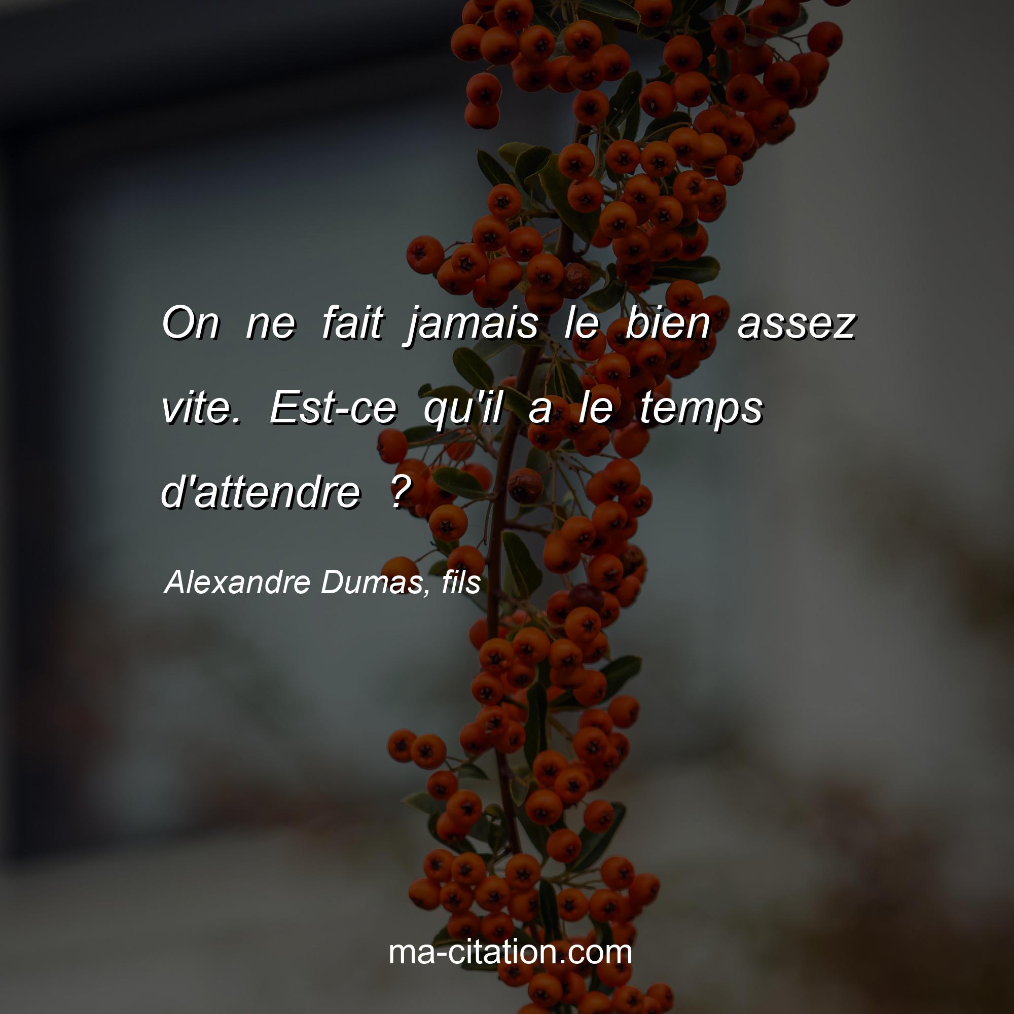 Citation sur la vie d'Alexandre Dumas, fils :On ne fait jamais le bien assez vite. Est-ce qu'il a le temps d'attendre ?
