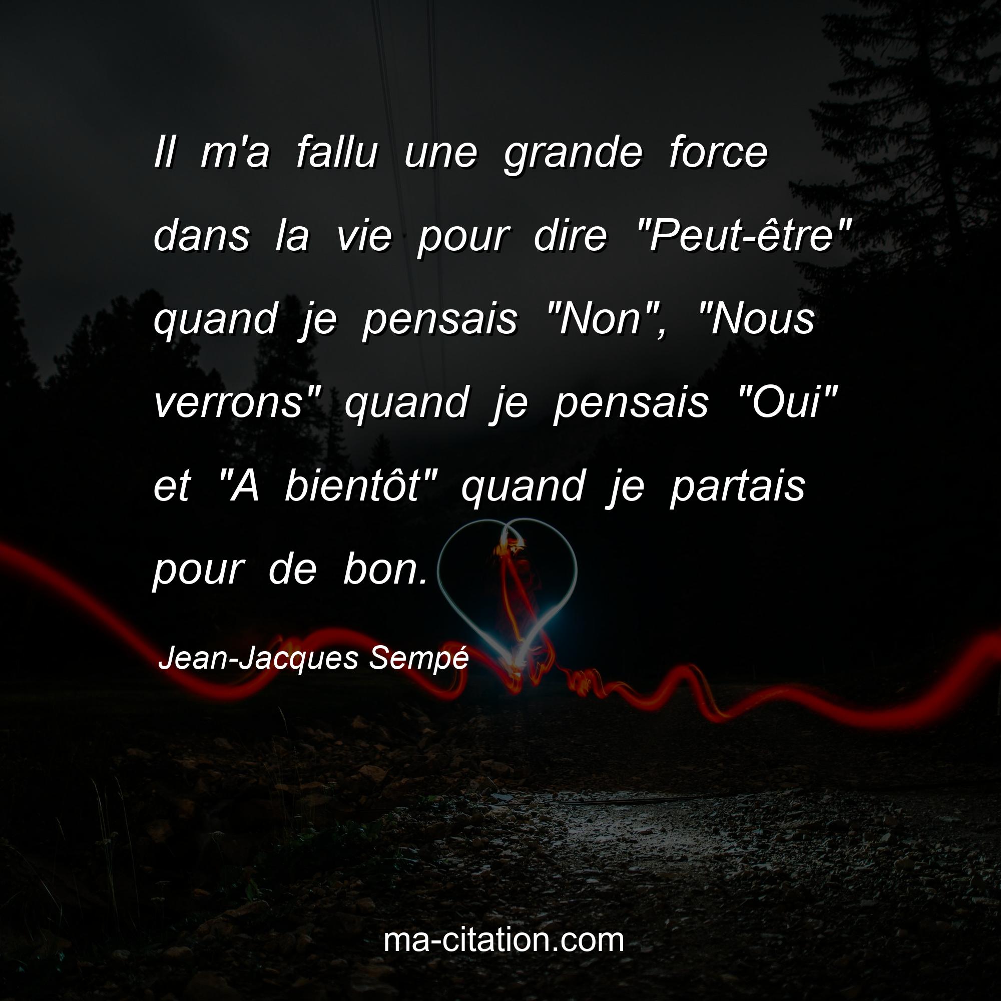Citation sur la vie de Jean-Jacques Sempé :Il m'a fallu une grande force dans la vie pour dire "Peut-être" quand je pensais "Non", "Nous verrons" quand je pensais "Oui" et "A bientôt" quand je partais pour de bon.