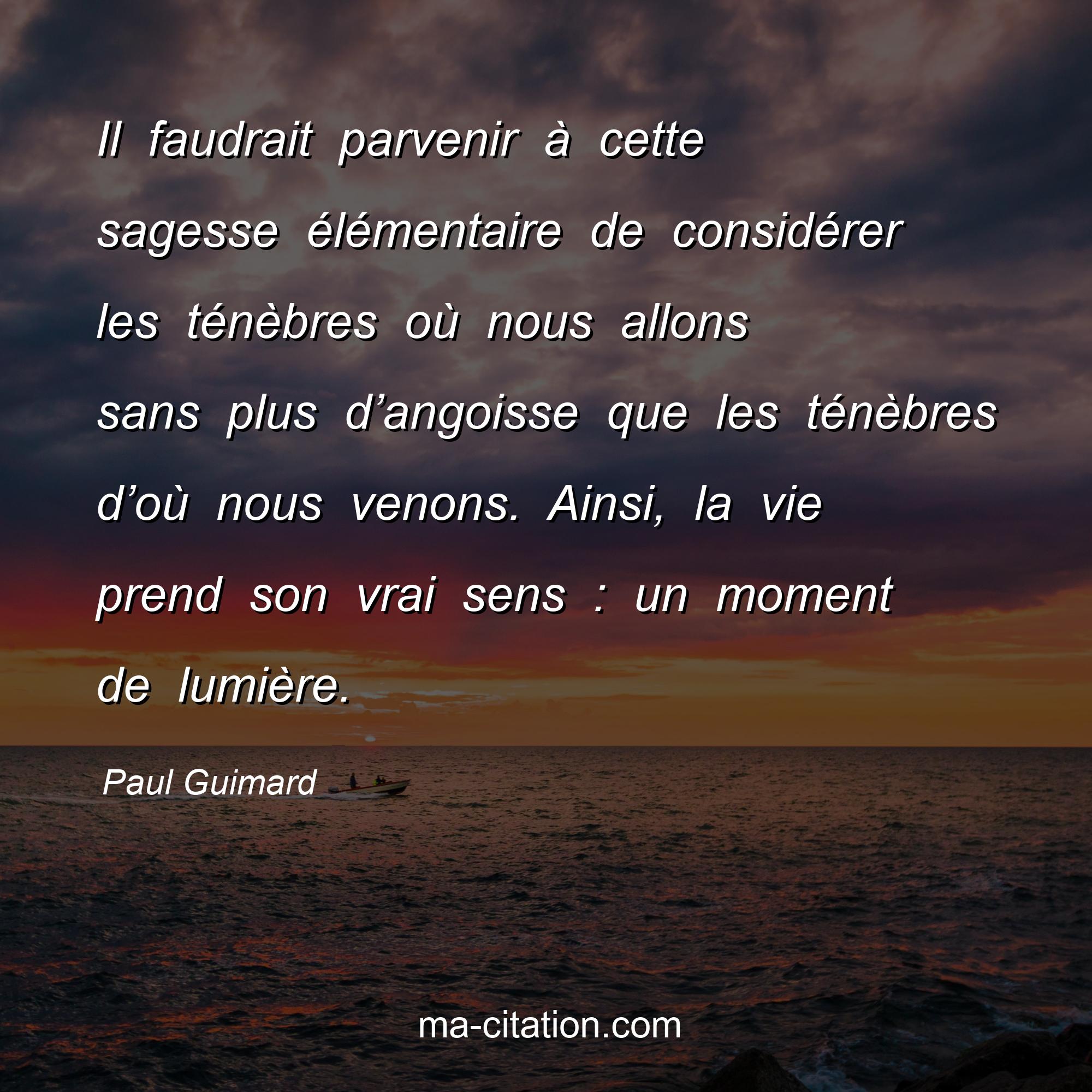 Citation sur la vie de Paul Guimard :Il faudrait parvenir à cette sagesse élémentaire de considérer les ténèbres où nous allons sans plus d’angoisse que les ténèbres d’où nous venons. Ainsi, la vie prend son vrai sens : un moment de lumière.