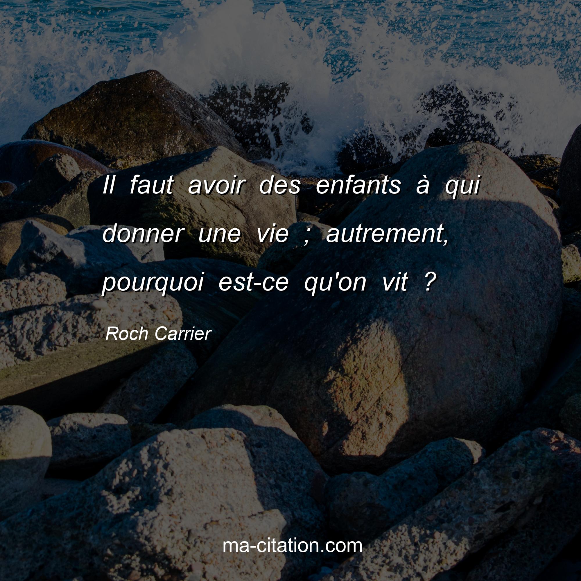 Roch Carrier est l'auteur de la citation sur la vie "Il faut avoir des enfants à qui donner une vie ; autrement, pourquoi est-ce qu'on vit ?".