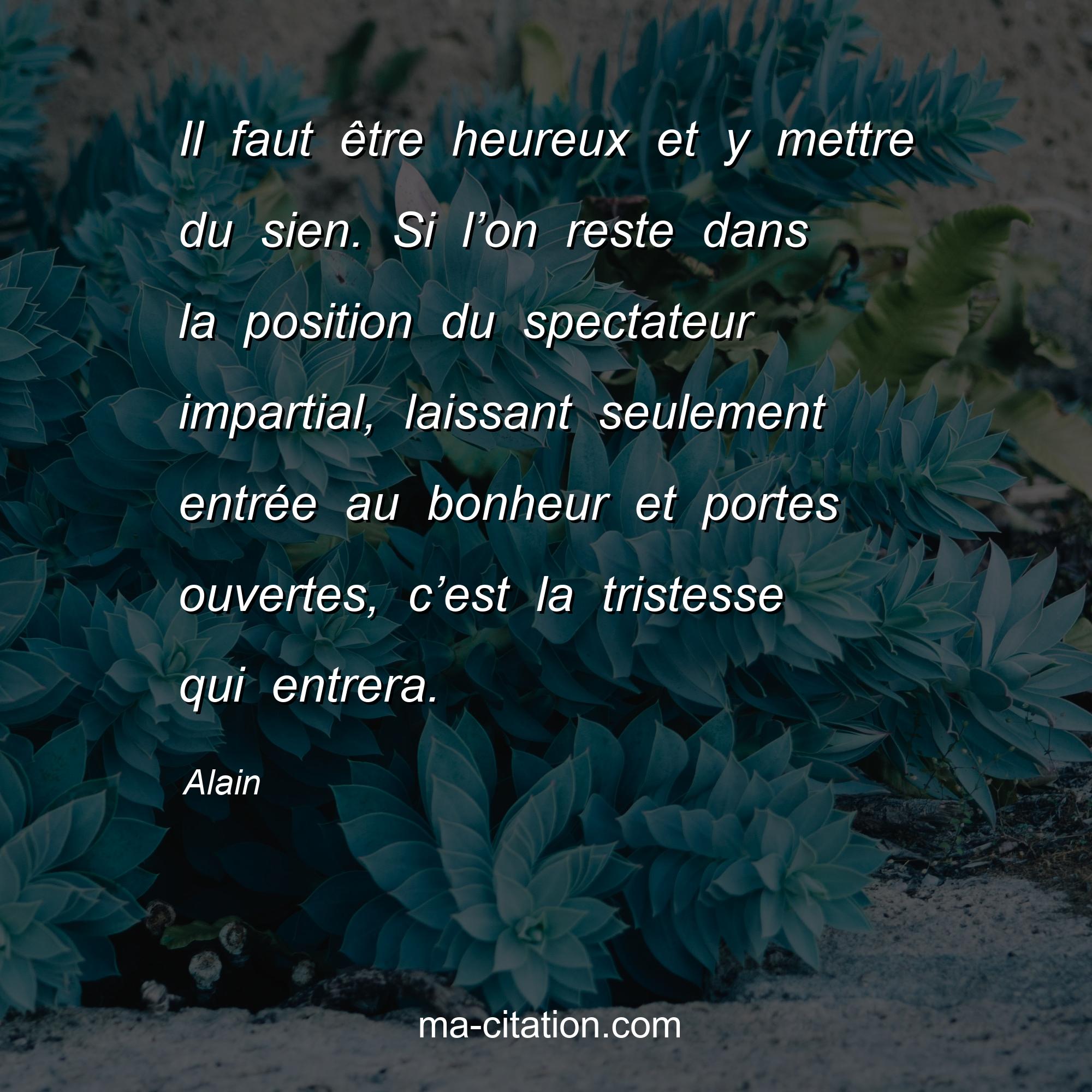 Citation sur la vie d'Alain :Il faut être heureux et y mettre du sien. Si l’on reste dans la position du spectateur impartial, laissant seulement entrée au bonheur et portes ouvertes, c’est la tristesse qui entrera.
