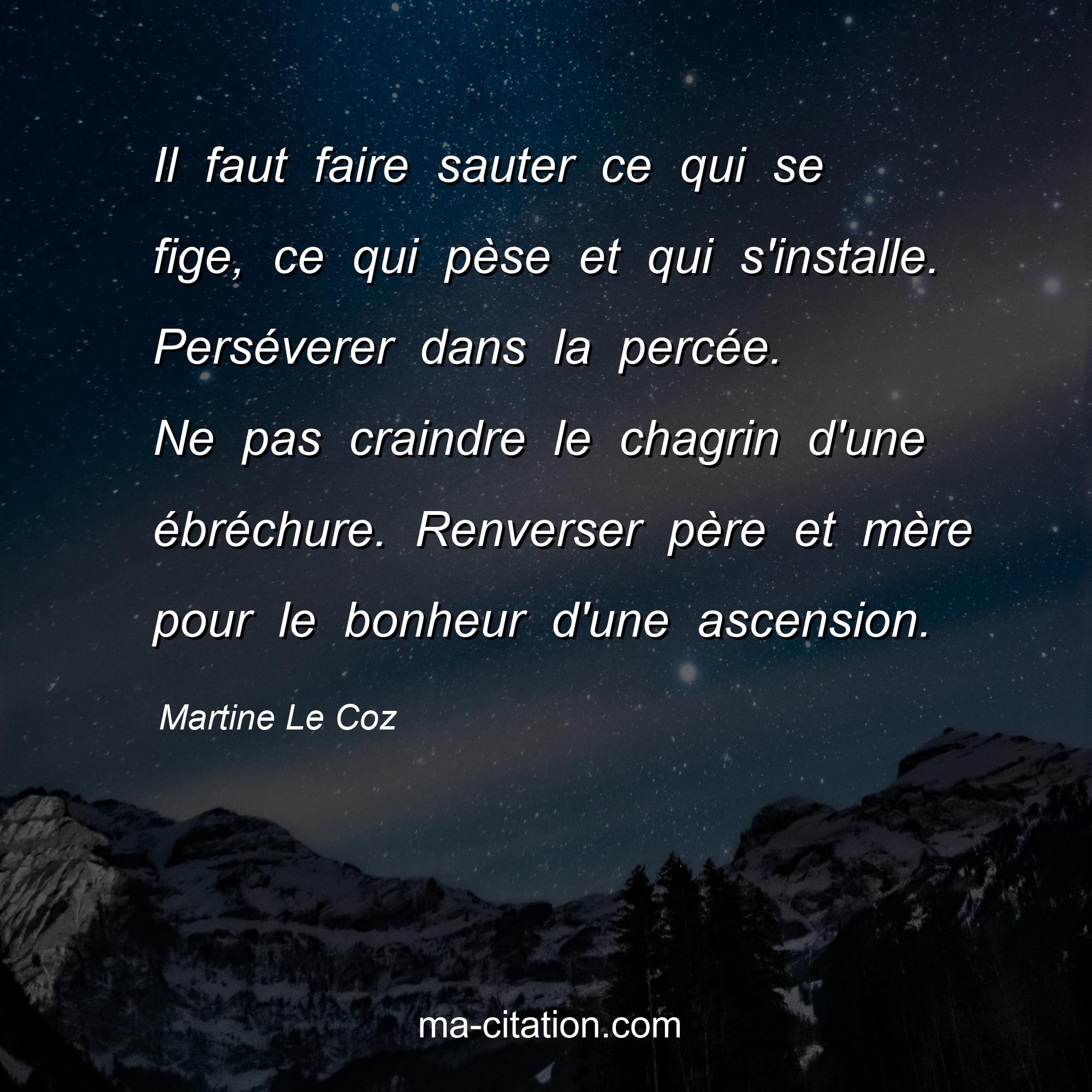 Citation sur la vie de Martine Le Coz :Il faut faire sauter ce qui se fige, ce qui pèse et qui s'installe. Perséverer dans la percée. Ne pas craindre le chagrin d'une ébréchure. Renverser père et mère pour le bonheur d'une ascension.