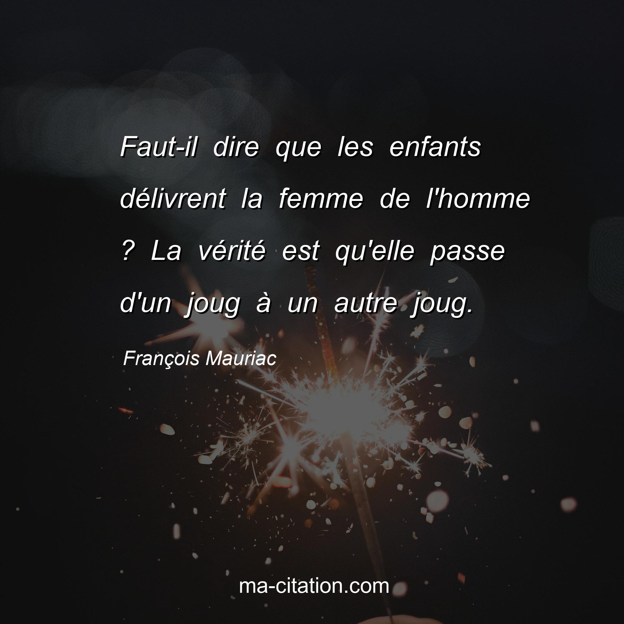 Citation sur la vie de François Mauriac :Faut-il dire que les enfants délivrent la femme de l'homme ? La vérité est qu'elle passe d'un joug à un autre joug.
