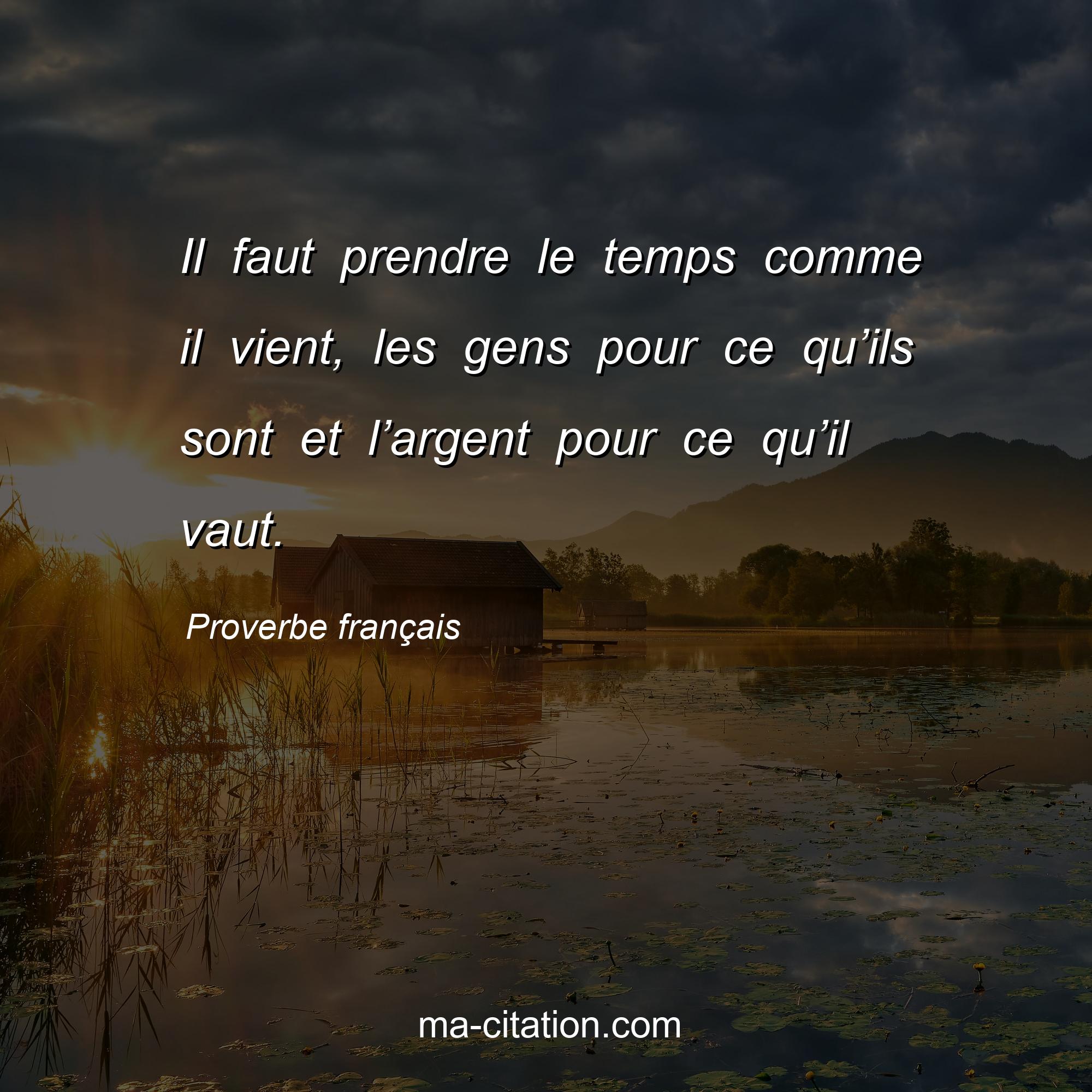 Proverbe français sur la vie :Il faut prendre le temps comme il vient, les gens pour ce qu’ils sont et l’argent pour ce qu’il vaut.