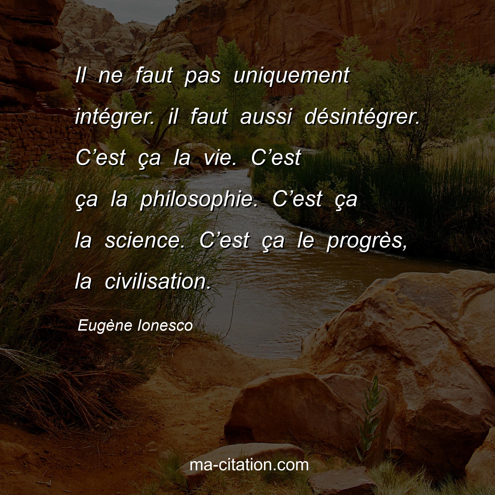 Eugène Ionesco est l'auteur de la citation sur la vie "Il ne faut pas uniquement intégrer. il faut aussi désintégrer. C’est ça la vie. C’est ça la philosophie. C’est ça la science. C’est ça le progrès, la civilisation.".