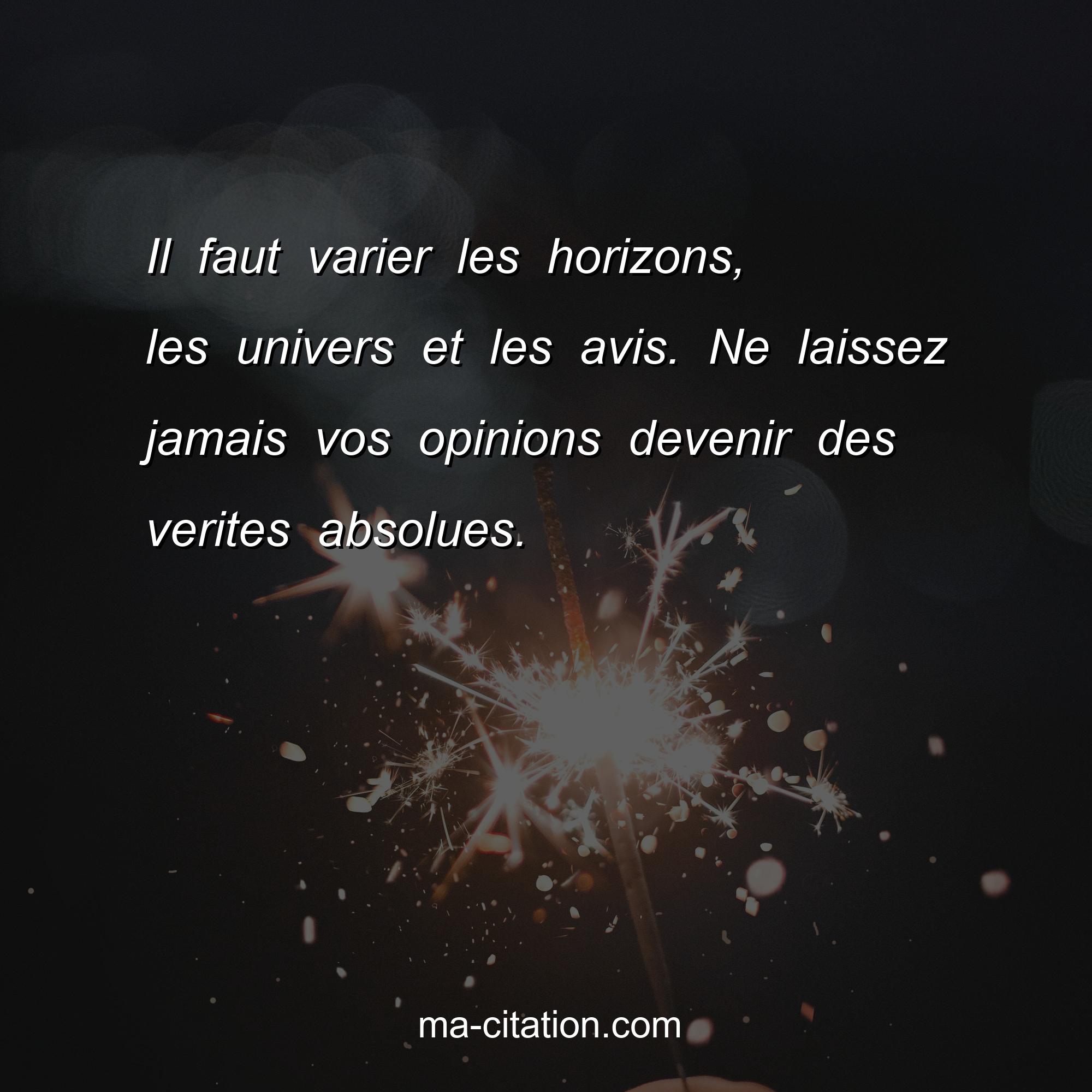 Citation sur la vie :Il faut varier les horizons, les univers et les avis. Ne laissez jamais vos opinions devenir des verites absolues.