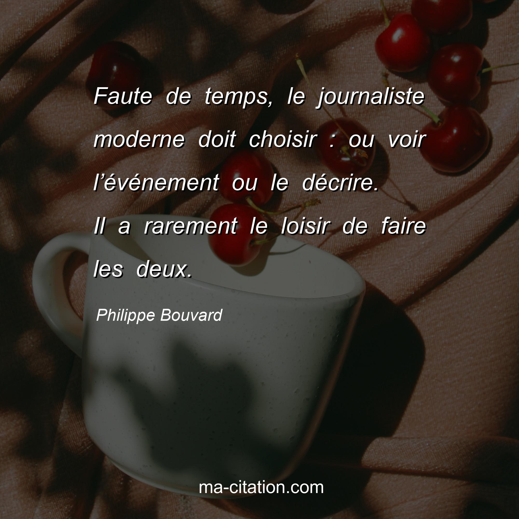 Citation sur la vie de Philippe Bouvard :Faute de temps, le journaliste moderne doit choisir : ou voir l’événement ou le décrire. Il a rarement le loisir de faire les deux.