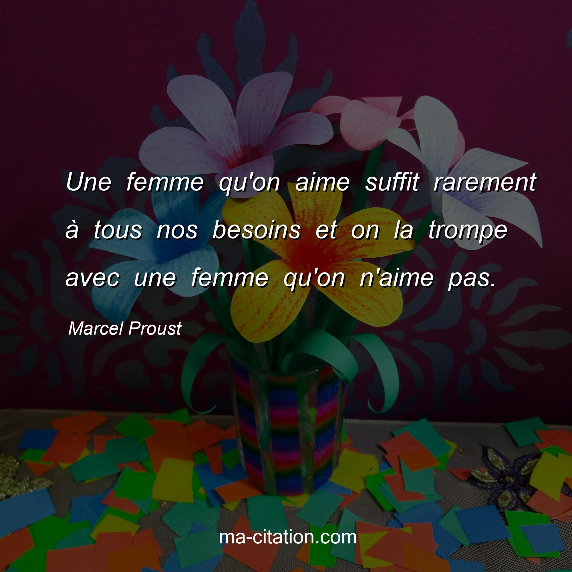 Citation sur la vie de Marcel Proust :Une femme qu'on aime suffit rarement à tous nos besoins et on la trompe avec une femme qu'on n'aime pas.