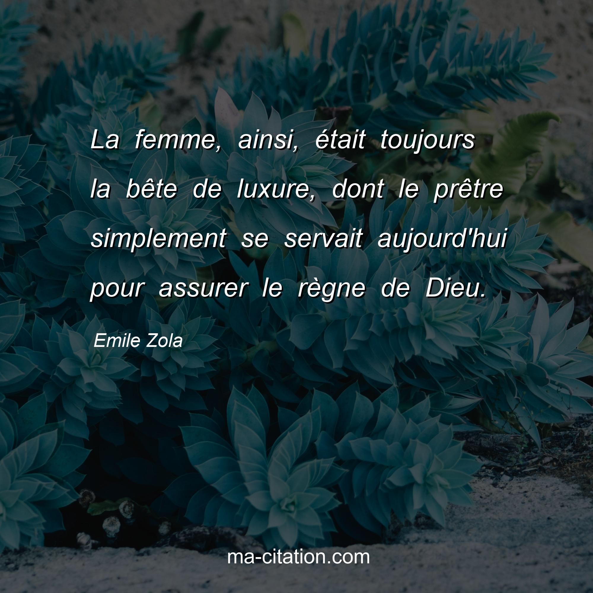 Citation sur la vie d'Emile Zola :La femme, ainsi, était toujours la bête de luxure, dont le prêtre simplement se servait aujourd'hui pour assurer le règne de Dieu.