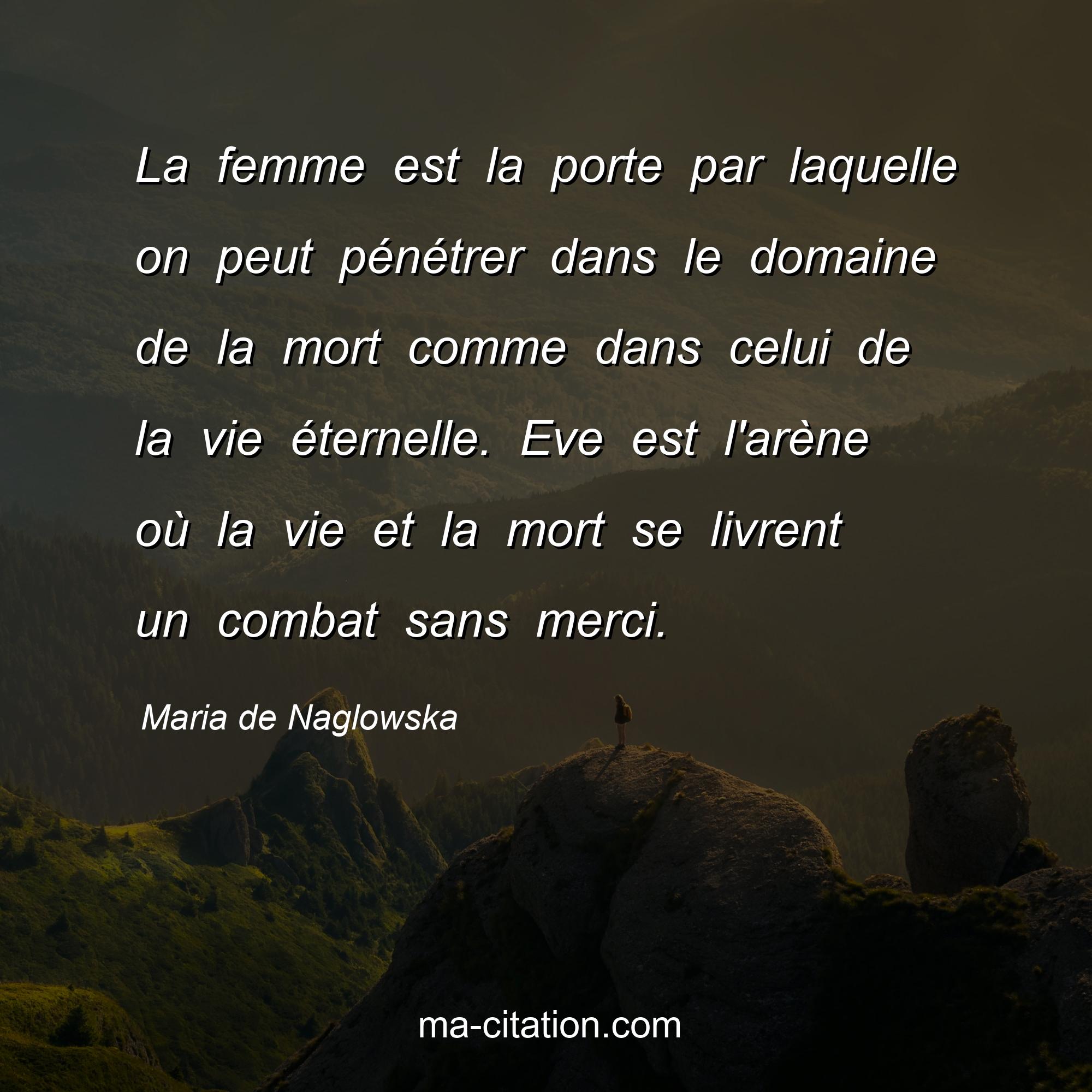 Citation sur la vie de Maria de Naglowska :La femme est la porte par laquelle on peut pénétrer dans le domaine de la mort comme dans celui de la vie éternelle. Eve est l'arène où la vie et la mort se livrent un combat sans merci.