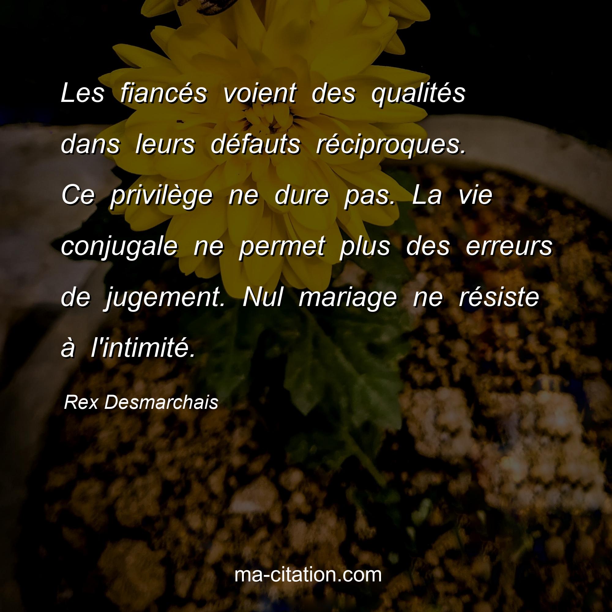 Rex Desmarchais est l'auteur de la citation sur la vie "Les fiancés voient des qualités dans leurs défauts réciproques. Ce privilège ne dure pas. La vie conjugale ne permet plus des erreurs de jugement. Nul mariage ne résiste à l'intimité.".