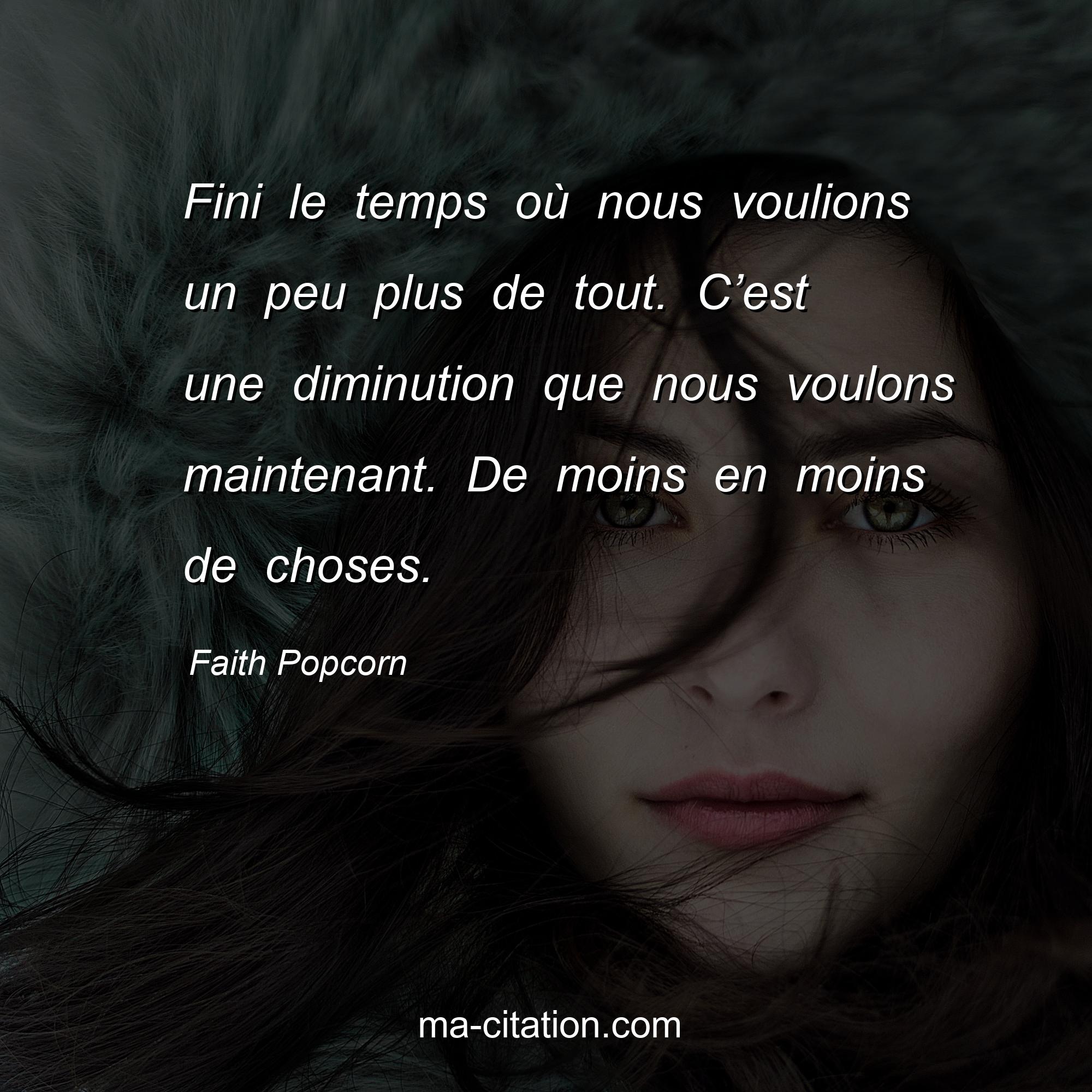 Citation sur la vie de Faith Popcorn :Fini le temps où nous voulions un peu plus de tout. C’est une diminution que nous voulons maintenant. De moins en moins de choses.