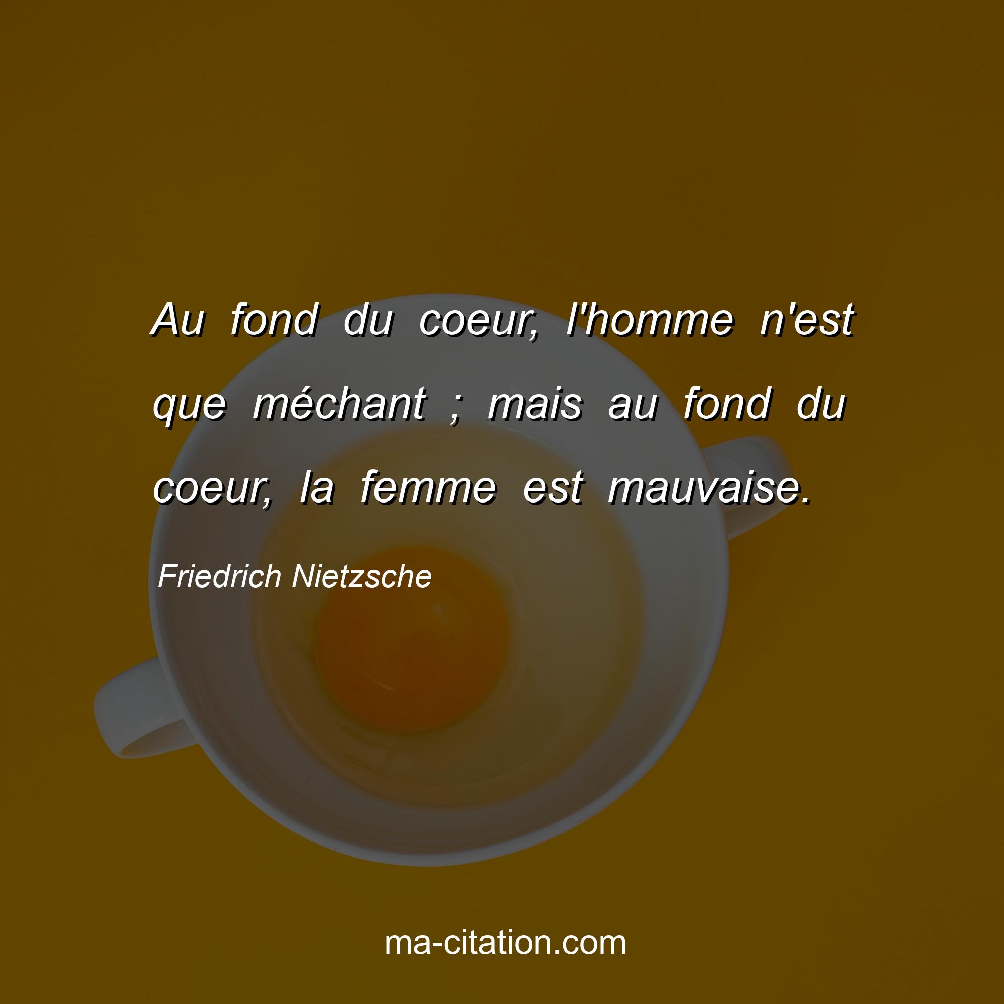 Citation sur la vie de Friedrich Nietzsche :Au fond du coeur, l'homme n'est que méchant ; mais au fond du coeur, la femme est mauvaise.