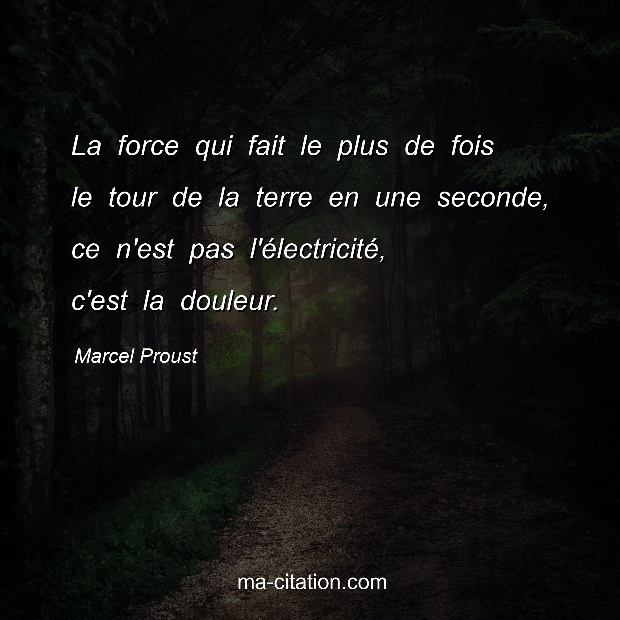 Citation sur la vie de Marcel Proust :La force qui fait le plus de fois le tour de la terre en une seconde, ce n'est pas l'électricité, c'est la douleur.