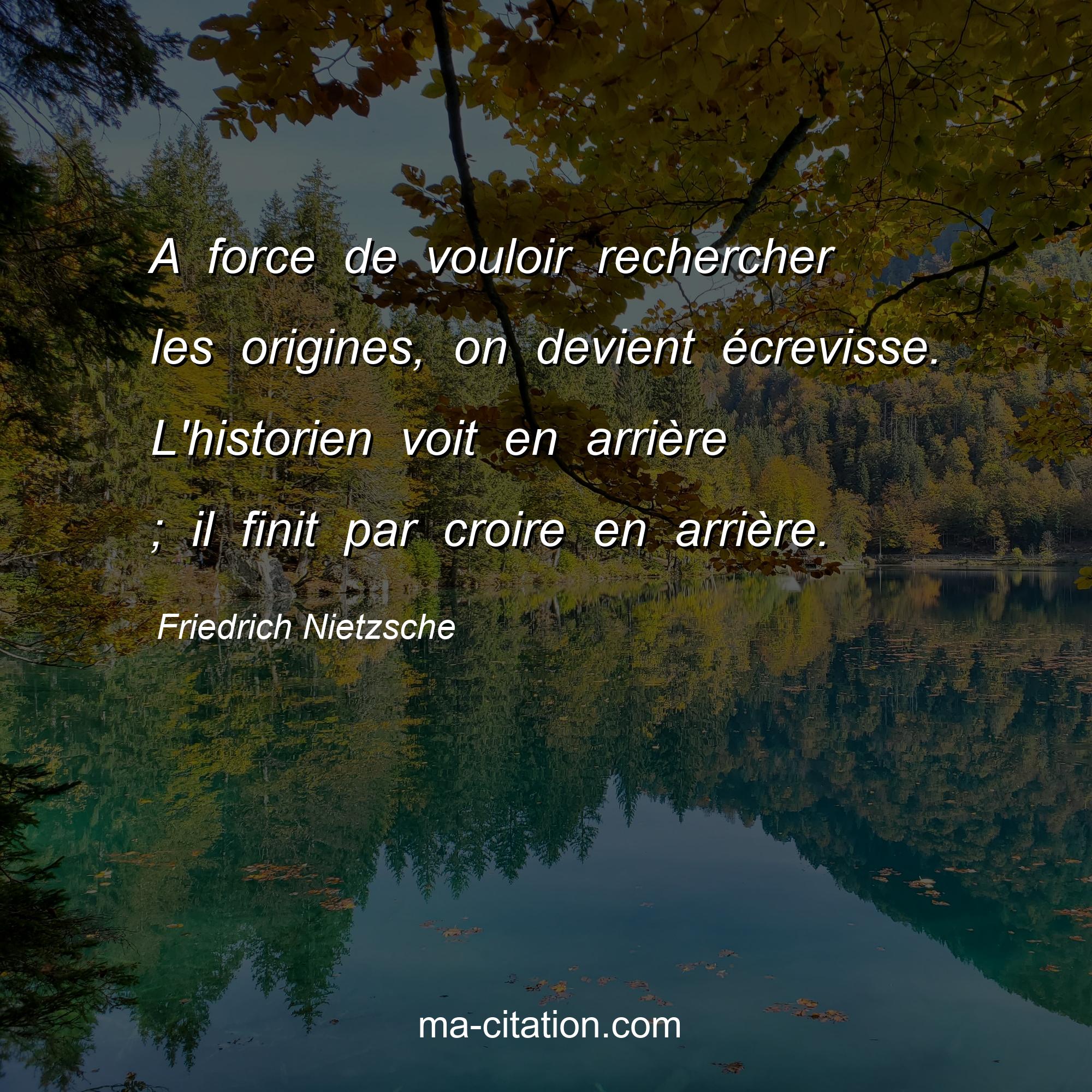 Citation sur la vie de Friedrich Nietzsche :A force de vouloir rechercher les origines, on devient écrevisse. L'historien voit en arrière ; il finit par croire en arrière.