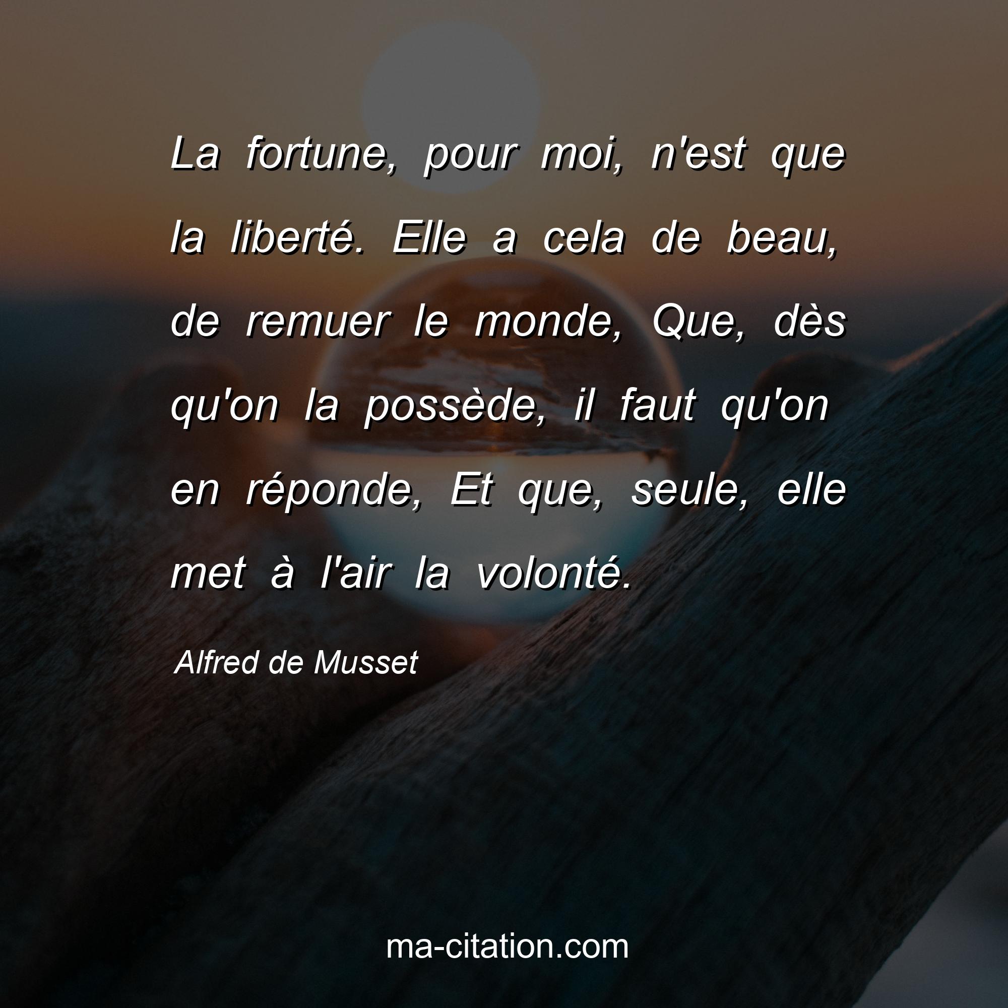 Citation sur la vie d'Alfred de Musset :La fortune, pour moi, n'est que la liberté. Elle a cela de beau, de remuer le monde, Que, dès qu'on la possède, il faut qu'on en réponde, Et que, seule, elle met à l'air la volonté.