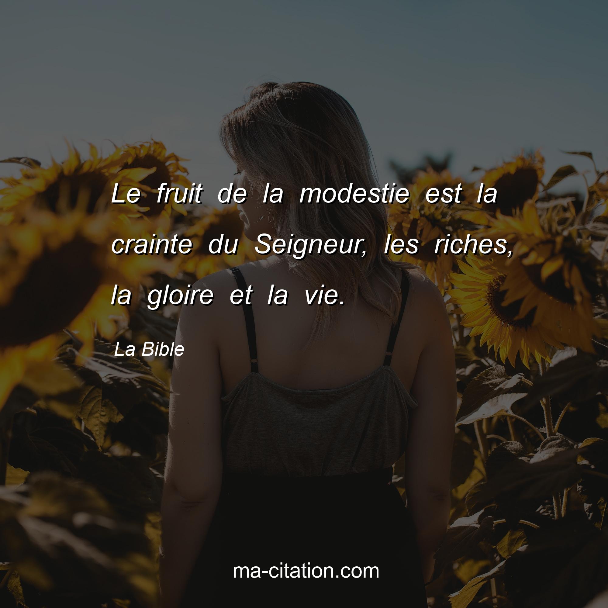 Citation sur la vie de La Bible :Le fruit de la modestie est la crainte du Seigneur, les riches, la gloire et la vie.