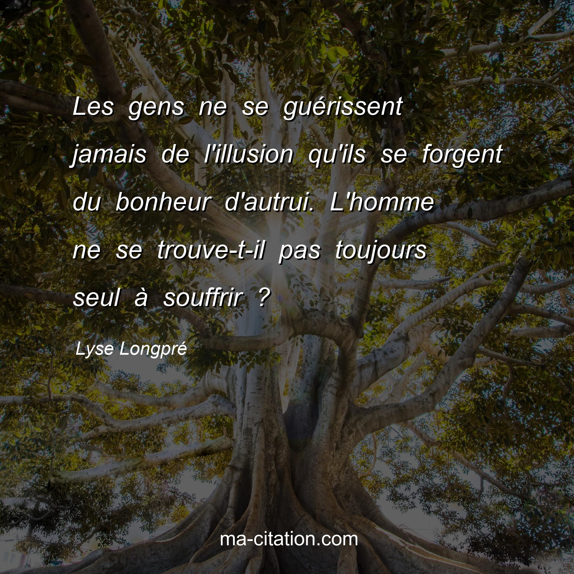 Lyse Longpré est l'auteur de la citation sur la vie "Les gens ne se guérissent jamais de l'illusion qu'ils se forgent du bonheur d'autrui. L'homme ne se trouve-t-il pas toujours seul à souffrir ?".