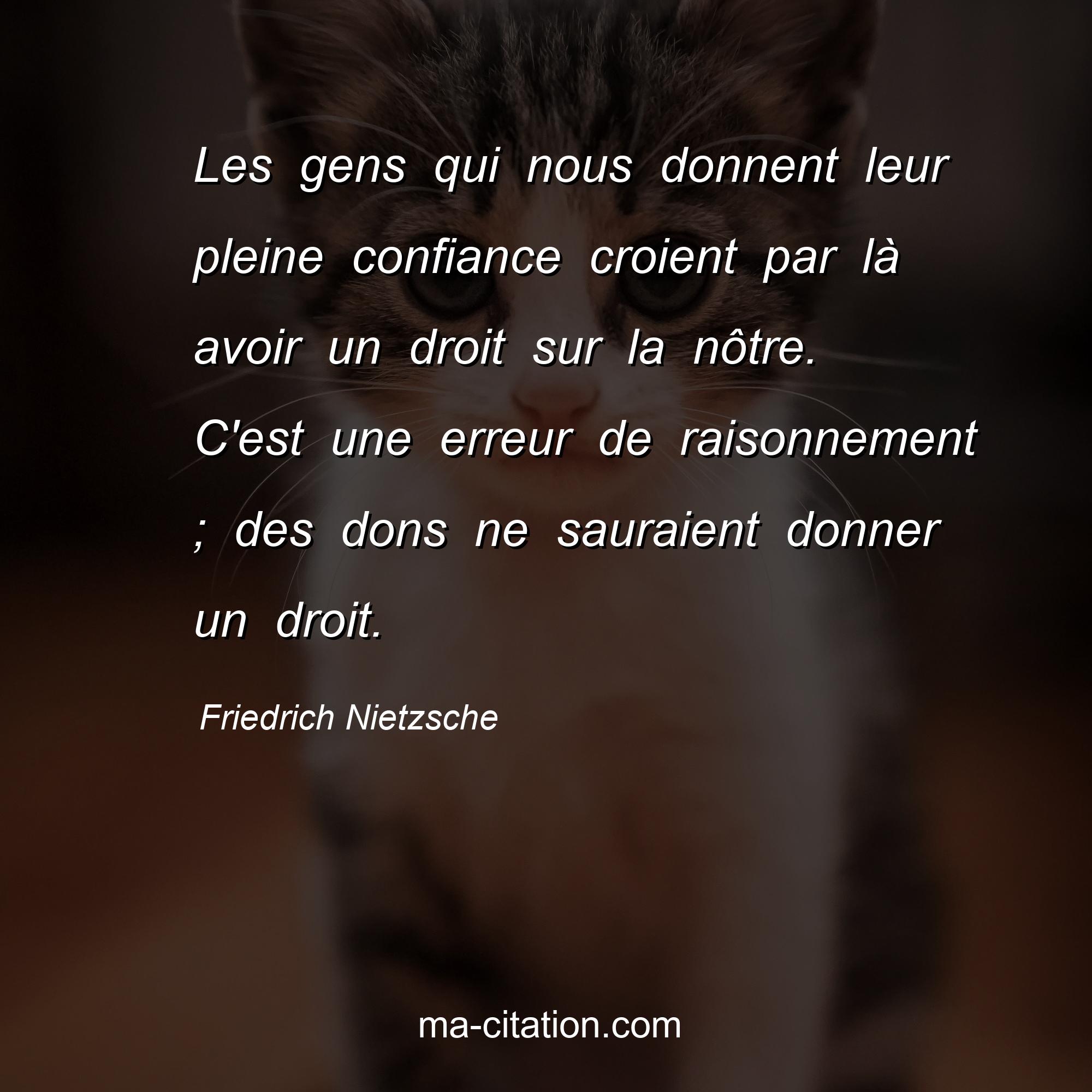 Citation sur la vie de Friedrich Nietzsche :Les gens qui nous donnent leur pleine confiance croient par là avoir un droit sur la nôtre. C'est une erreur de raisonnement ; des dons ne sauraient donner un droit.