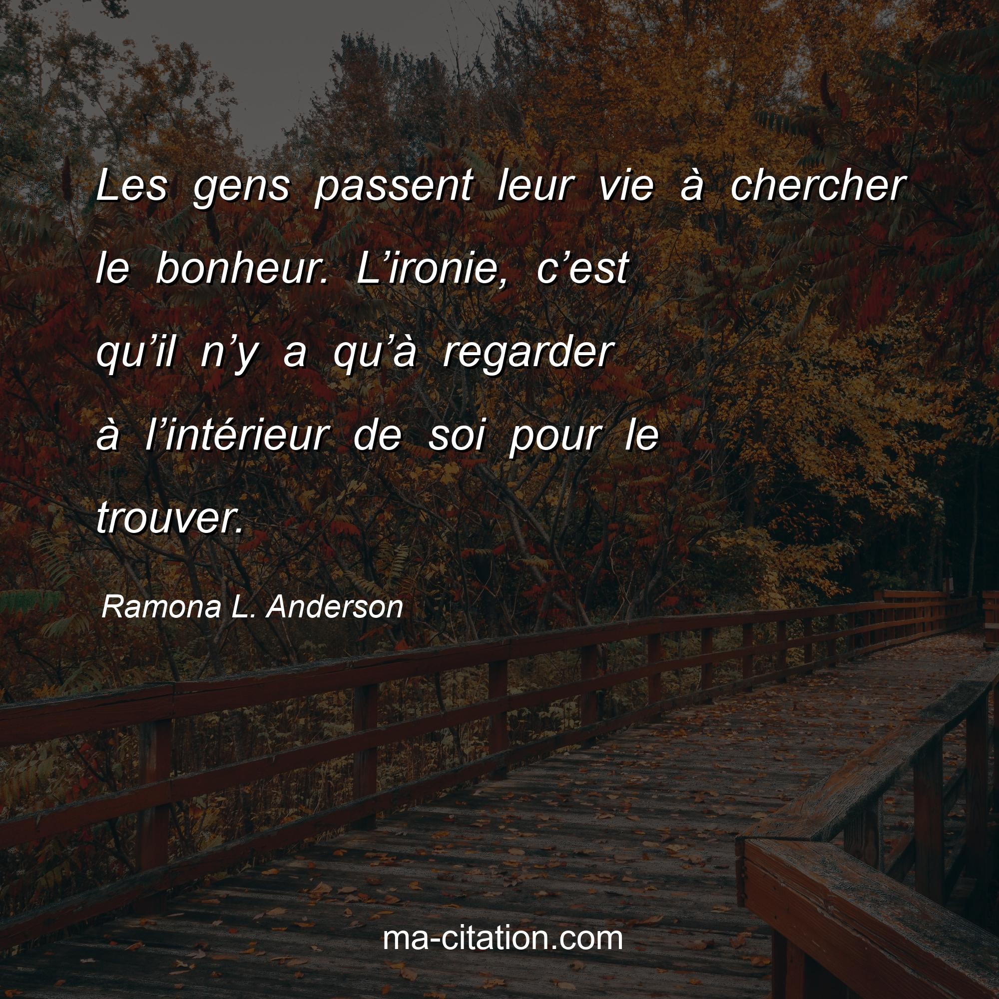 Citation sur la vie de Ramona L. Anderson :Les gens passent leur vie à chercher le bonheur. L’ironie, c’est qu’il n’y a qu’à regarder à l’intérieur de soi pour le trouver.