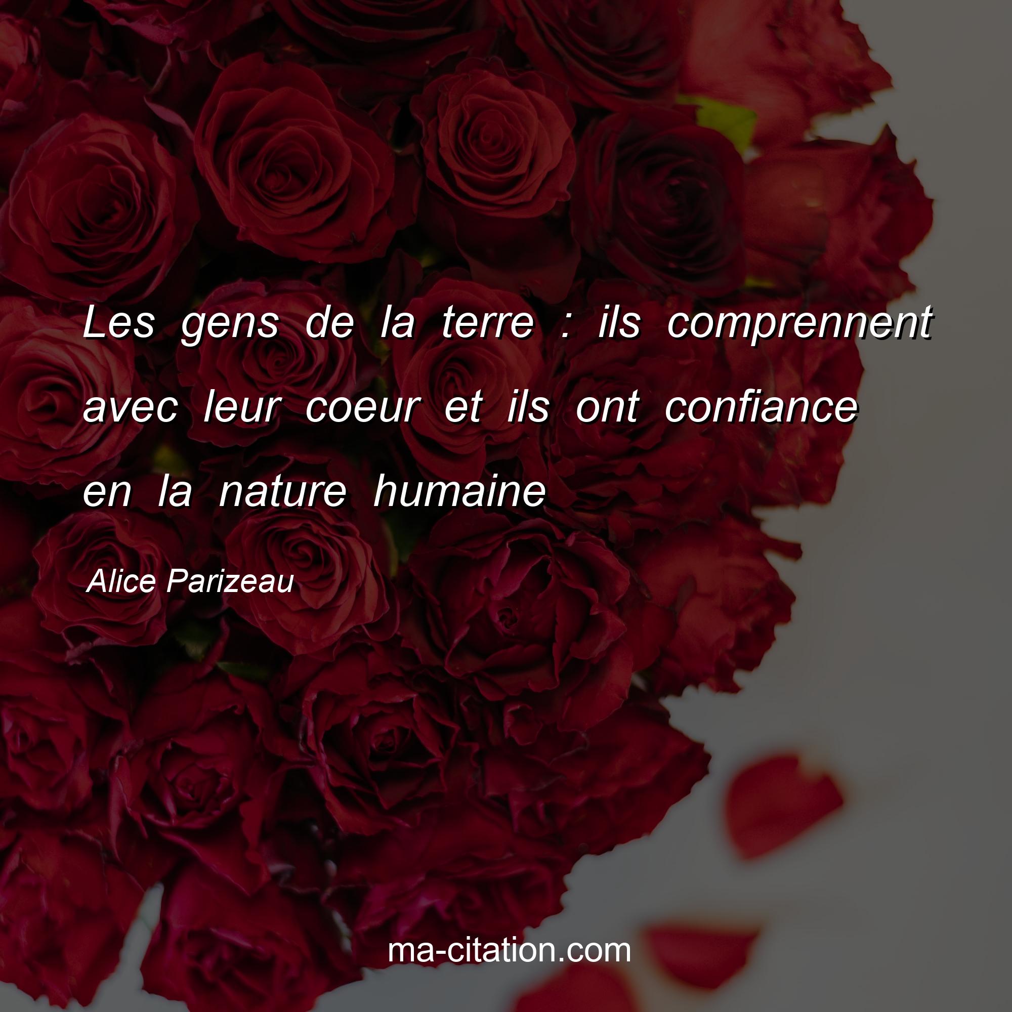 Alice Parizeau est l'auteur de la citation sur la vie "Les gens de la terre : ils comprennent avec leur coeur et ils ont confiance en la nature humaine".