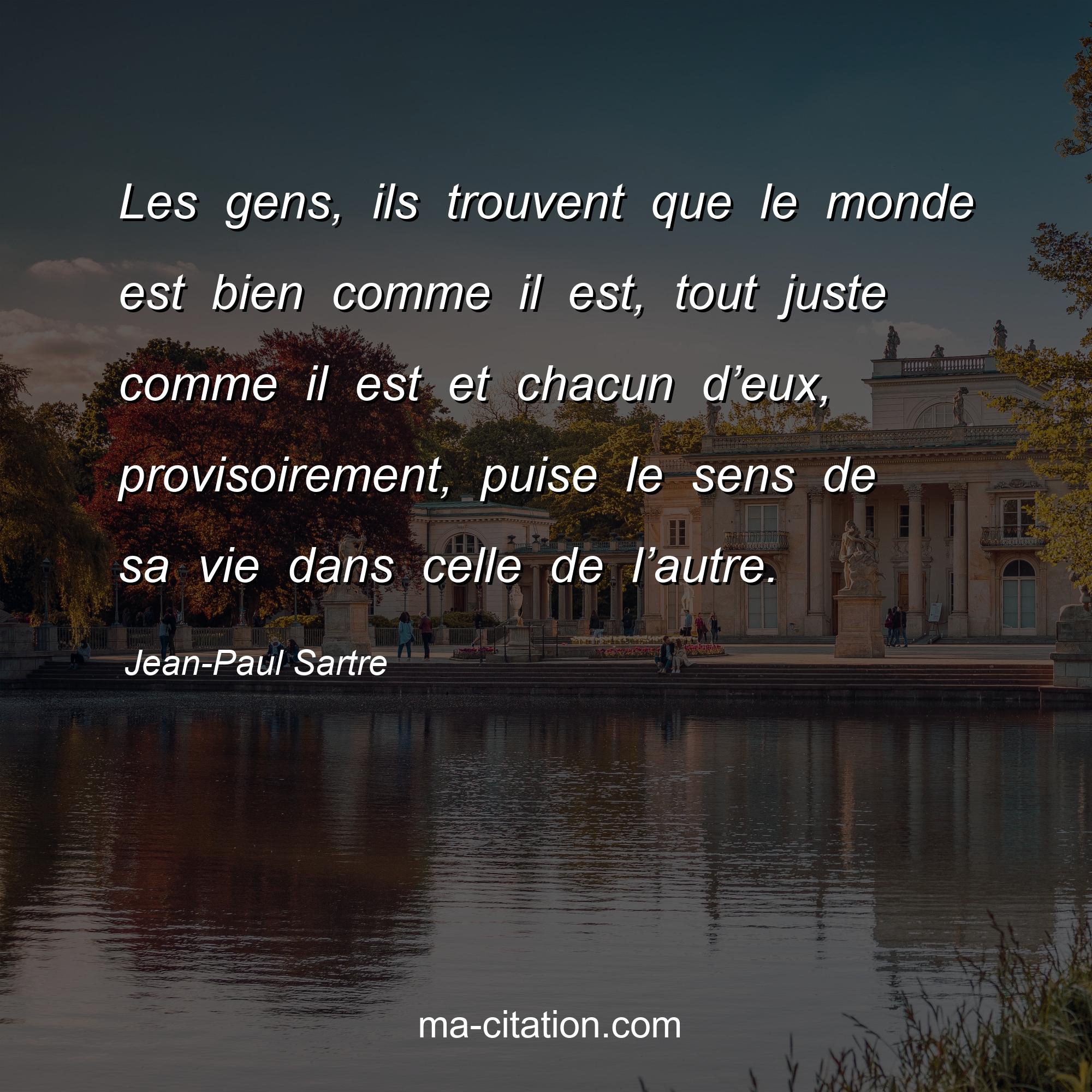 Citation sur la vie de Jean-Paul Sartre :Les gens, ils trouvent que le monde est bien comme il est, tout juste comme il est et chacun d’eux, provisoirement, puise le sens de sa vie dans celle de l’autre.