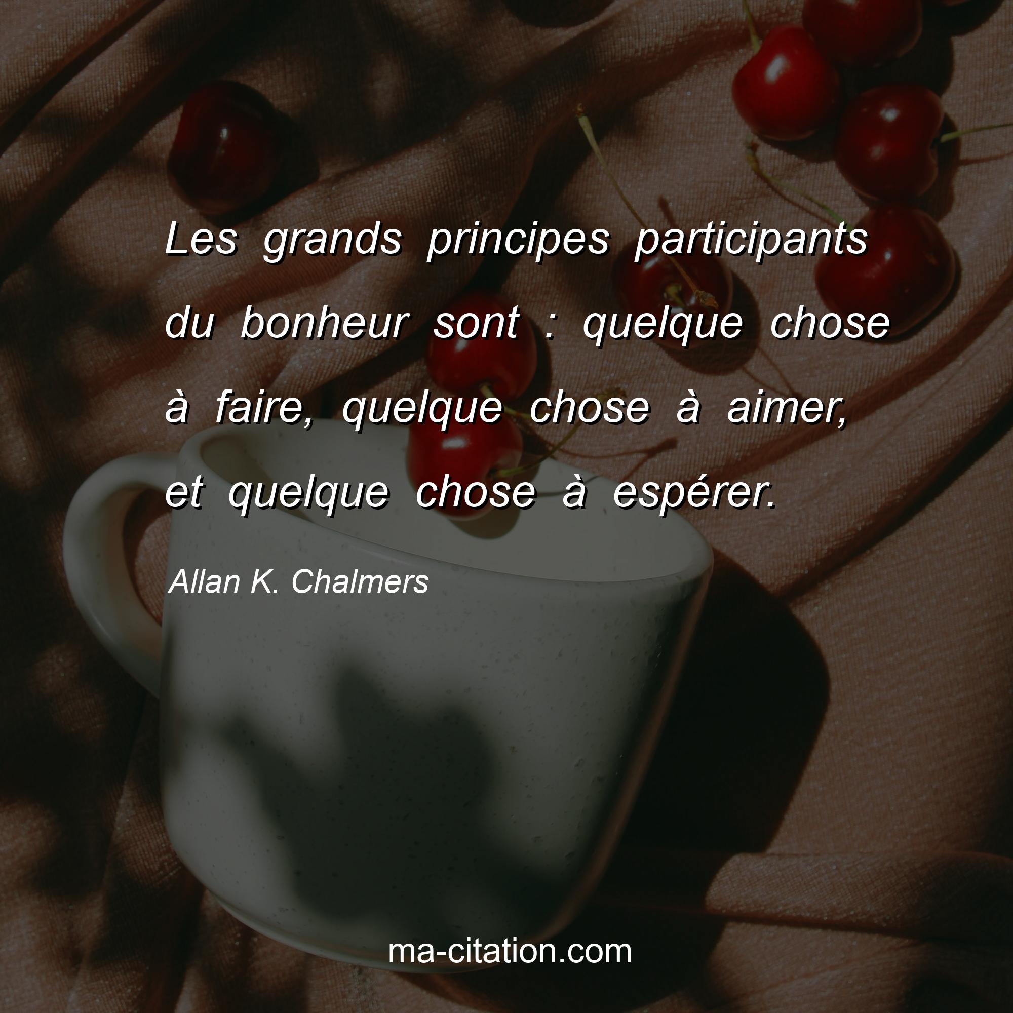 Citation sur la vie d'Allan K. Chalmers :Les grands principes participants du bonheur sont : quelque chose à faire, quelque chose à aimer, et quelque chose à espérer.