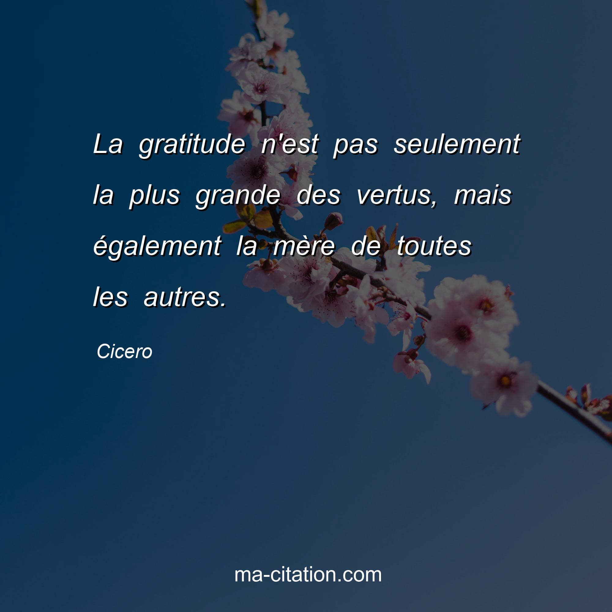 Cicero est l'auteur de la citation sur la vie "La gratitude n'est pas seulement la plus grande des vertus, mais également la mère de toutes les autres.".