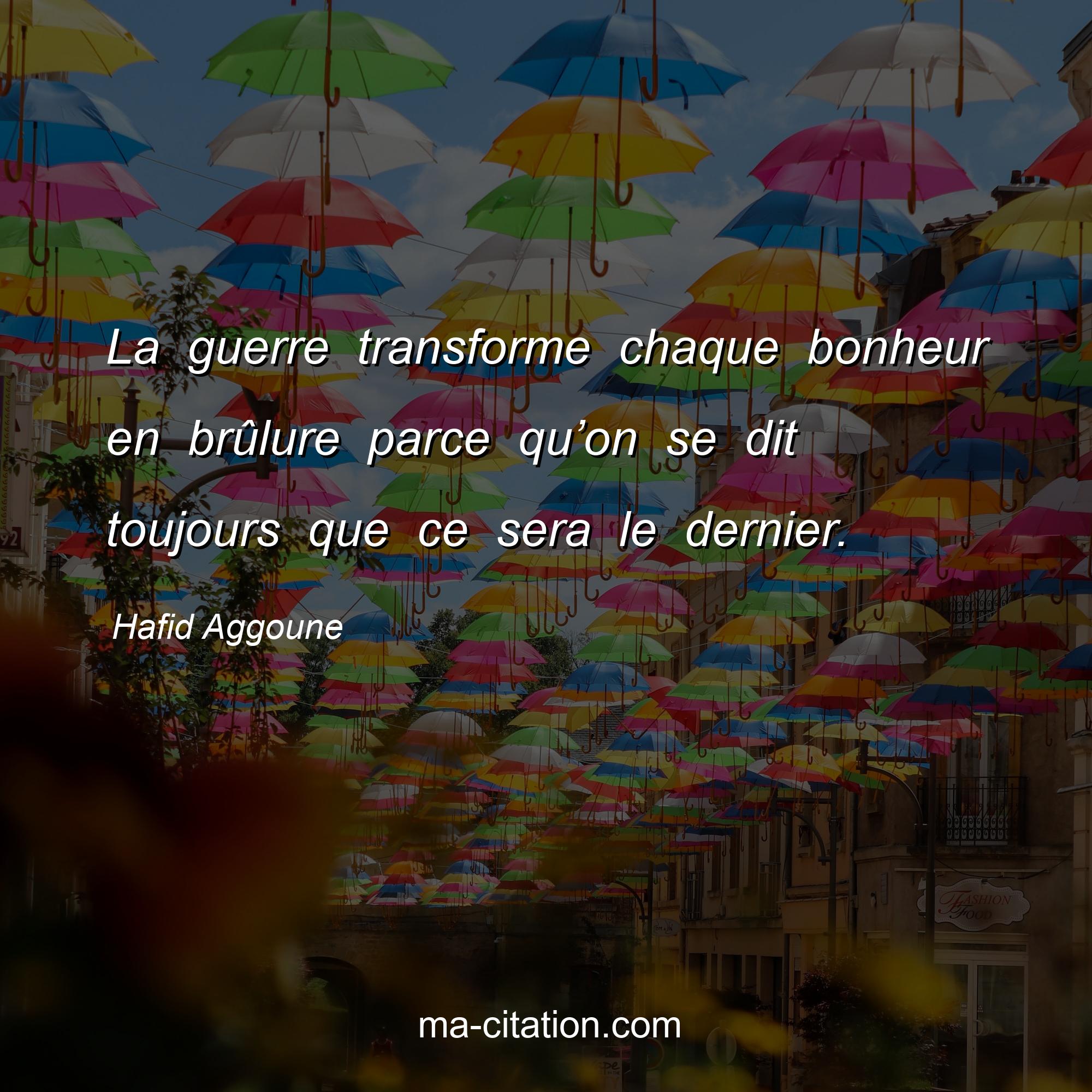 Hafid Aggoune est l'auteur de la citation sur la vie "La guerre transforme chaque bonheur en brûlure parce qu’on se dit toujours que ce sera le dernier.".
