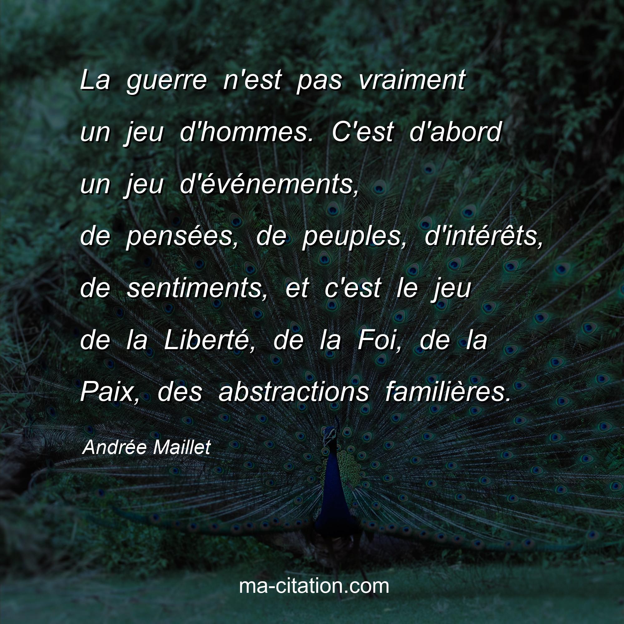 Citation sur la vie d'Andrée Maillet :La guerre n'est pas vraiment un jeu d'hommes. C'est d'abord un jeu d'événements, de pensées, de peuples, d'intérêts, de sentiments, et c'est le jeu de la Liberté, de la Foi, de la Paix, des abstractions familières.