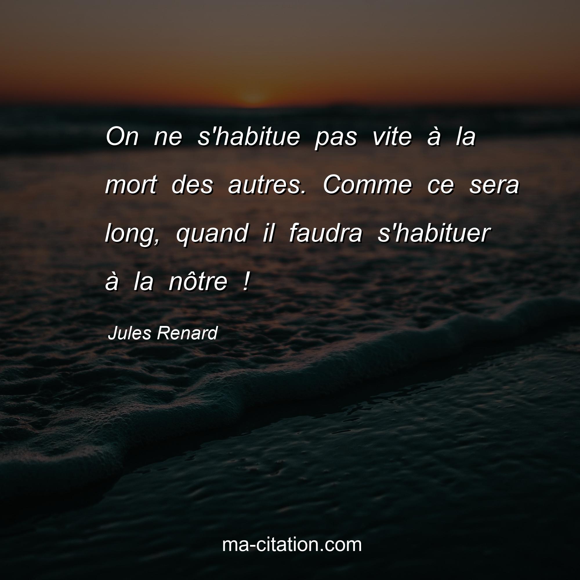 Citation sur la vie de Jules Renard :On ne s'habitue pas vite à la mort des autres. Comme ce sera long, quand il faudra s'habituer à la nôtre !