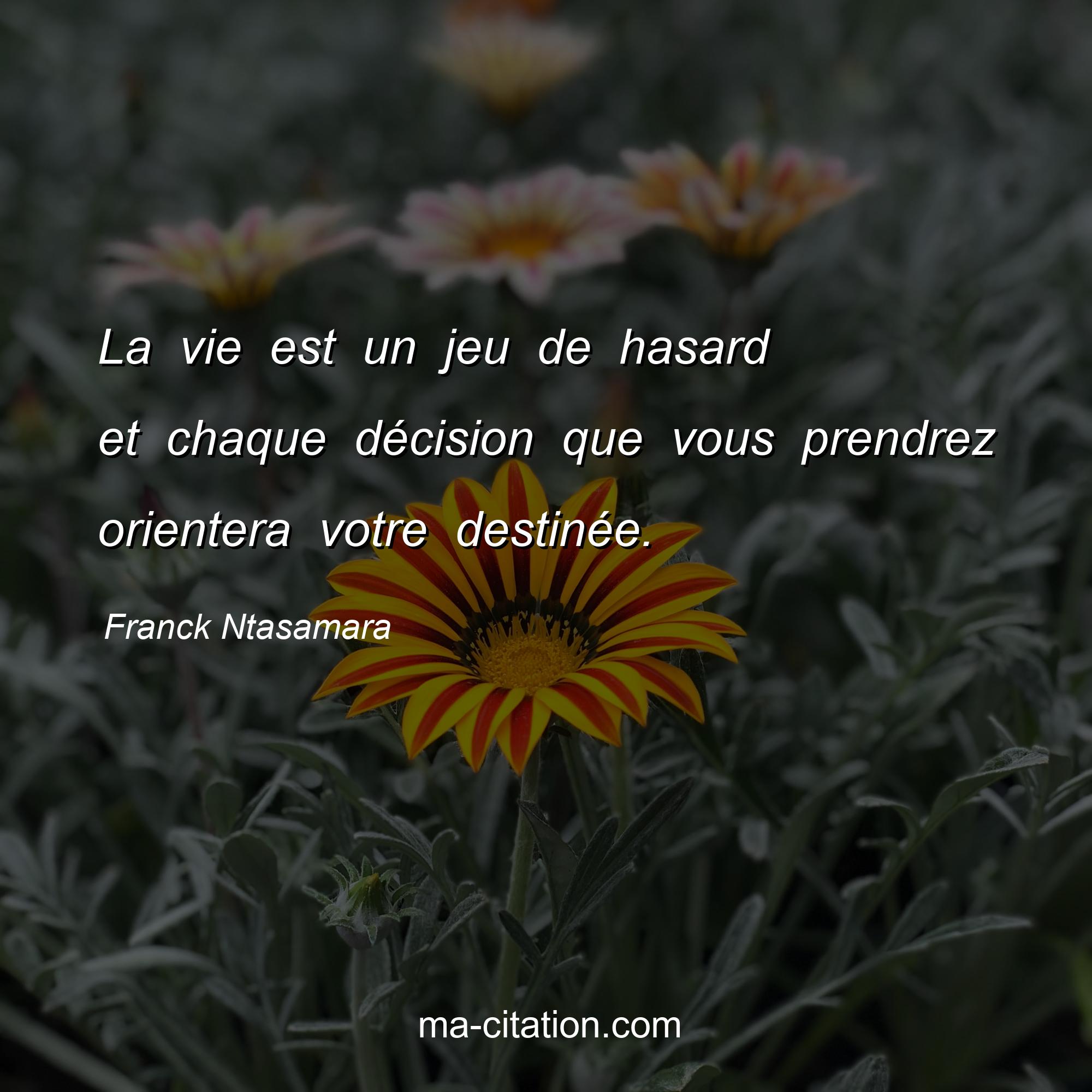 Franck Ntasamara est l'auteur de la citation sur la vie "La vie est un jeu de hasard et chaque décision que vous prendrez orientera votre destinée.".