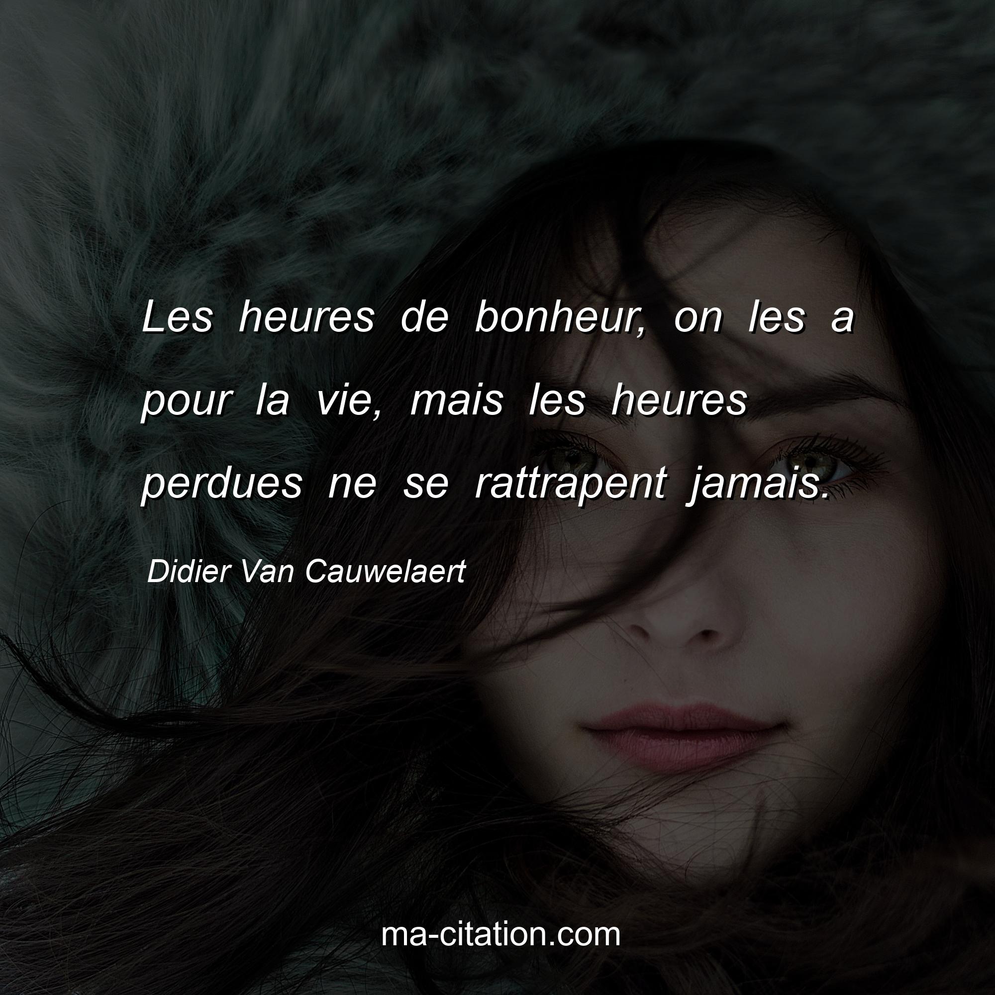 Citation sur la vie de Didier Van Cauwelaert :Les heures de bonheur, on les a pour la vie, mais les heures perdues ne se rattrapent jamais.