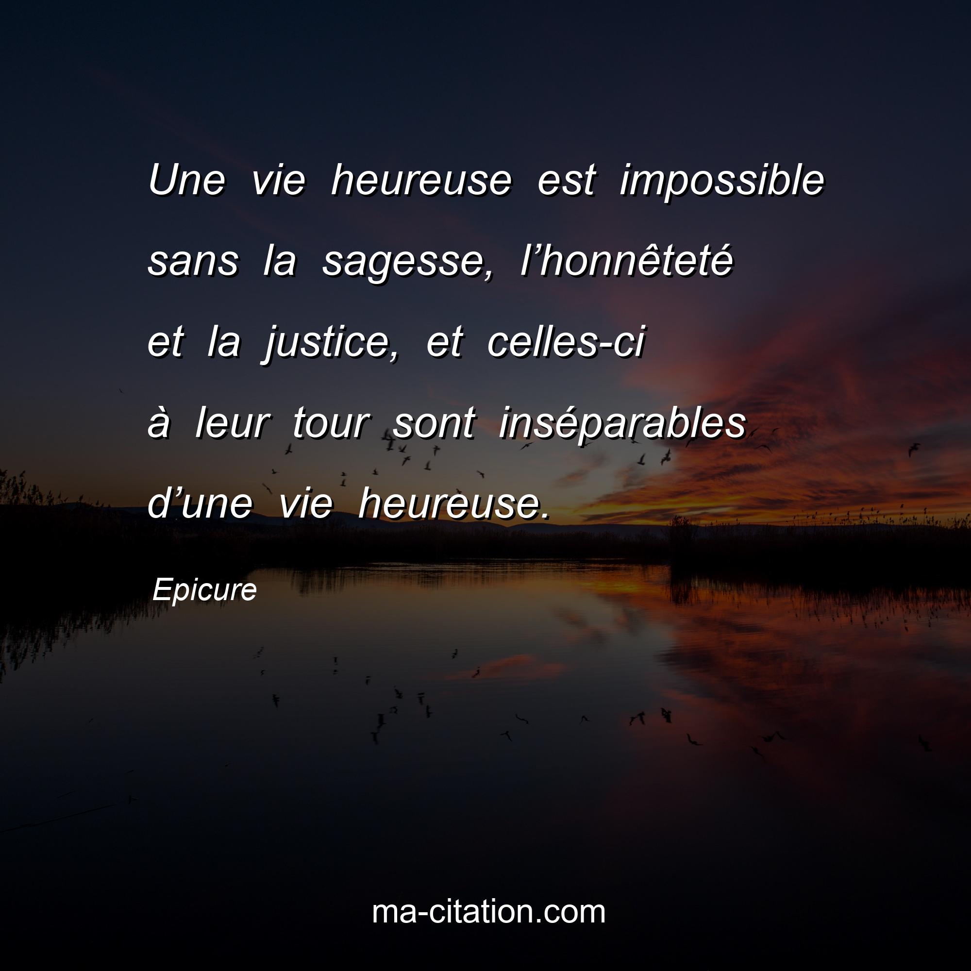 Epicure est l'auteur de la citation sur la vie "Une vie heureuse est impossible sans la sagesse, l’honnêteté et la justice, et celles-ci à leur tour sont inséparables d’une vie heureuse.".
