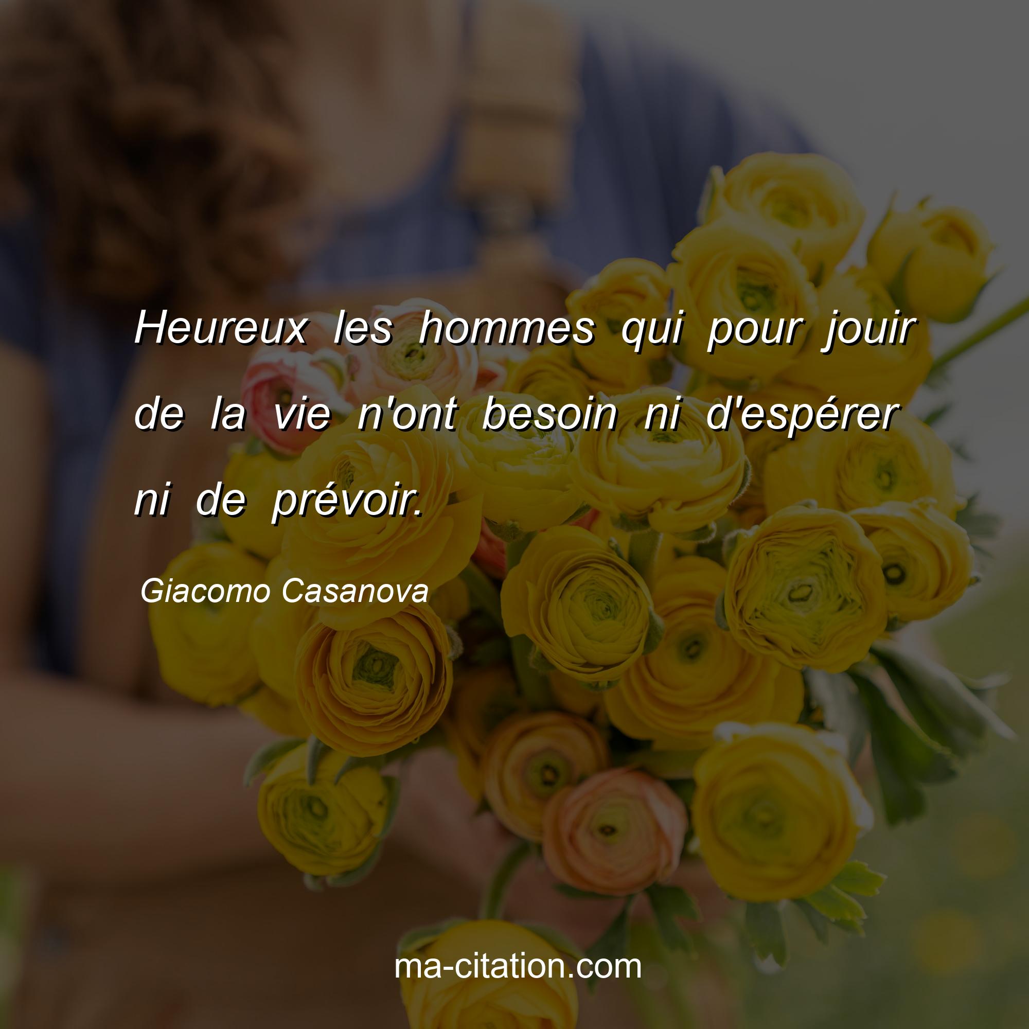 Citation sur la vie de Giacomo Casanova :Heureux les hommes qui pour jouir de la vie n'ont besoin ni d'espérer ni de prévoir.