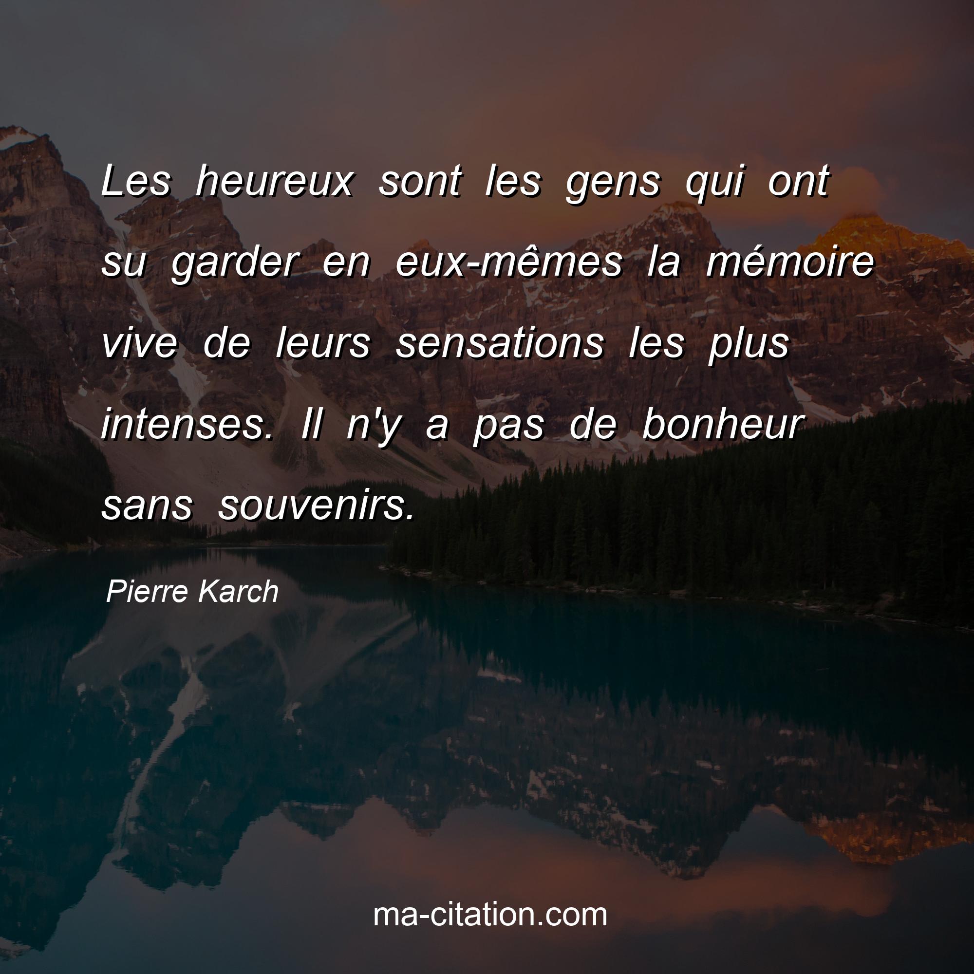 Citation sur la vie de Pierre Karch :Les heureux sont les gens qui ont su garder en eux-mêmes la mémoire vive de leurs sensations les plus intenses. Il n'y a pas de bonheur sans souvenirs.