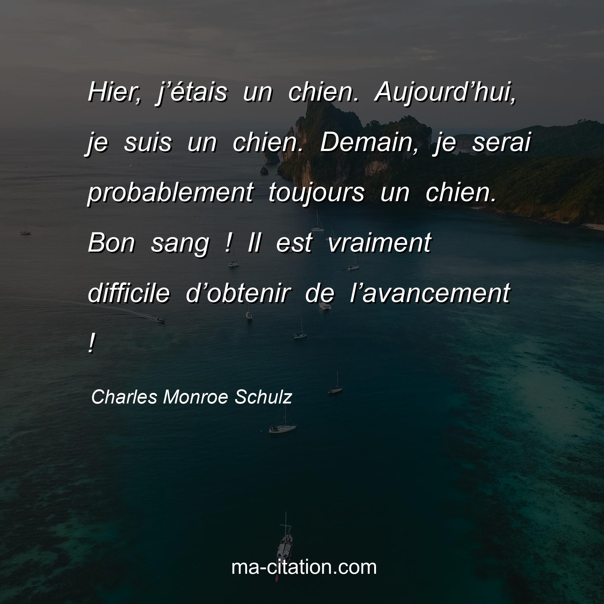 Citation sur la vie de Charles Monroe Schulz :Hier, j’étais un chien. Aujourd’hui, je suis un chien. Demain, je serai probablement toujours un chien. Bon sang ! Il est vraiment difficile d’obtenir de l’avancement !